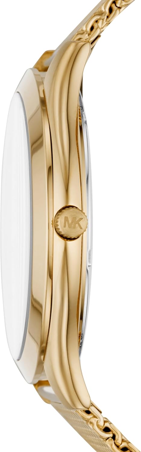 Add dazzling charm to any ensemble with this luxe Micheal Kors® – Slim Runway watch. Slim stainless steel case. Slim gold-tone stainless steel bracelet with fold-over, double push-button release. Round face. Three-hand analog display with quartz movement. Gold dial features gold-tone hands, stick hour markers, and Michael Kors detailing. Water resistant up to 165 feet. Display case included. Imported. Measurements: Case Height: 41 1⁄10 mm Case Width: 41 1⁄10 mm Case Depth: 8 3⁄5 mm Band Width: 21 9⁄10 mm Band Circumference/Length: 9 in Weight: 3.8 oz