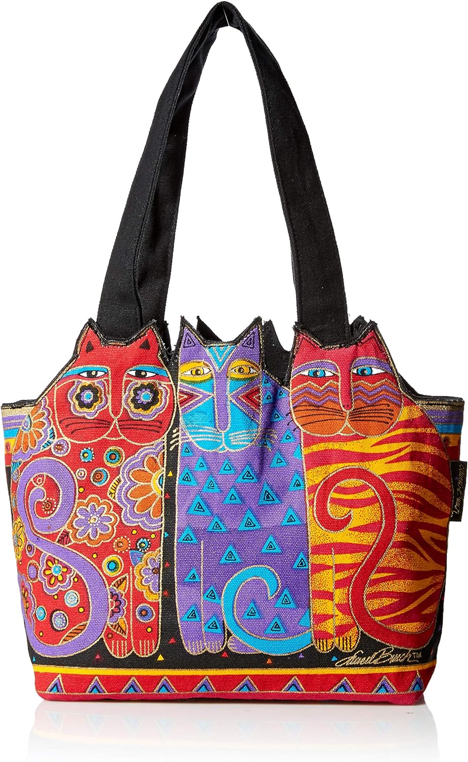 LAUREL BURCH-Medium Tote: Tres Gatos. The bright vivid colors and whimsical creatures that are the signature design of artist Laurel Burch adorn this canvas tote that is both a practical bag and a beautiful piece of art. This 8-1/2×12-1/2×3-1/2 inch Medium Tote features one main zippered compartment; one small zippered pocket inside; a removable bottom support panel; and two strap handles. Colors: orange; red; and purple. Imported.