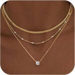 WomenGifts Layered Gold Necklaces for Women, 14K Gold Sterling Silver Plated Dainty Pendant Necklace Set with Cubic Zirconia Circle, Chunky Stackable Cuban Chain Choker, Trendy Personalized Birthstone