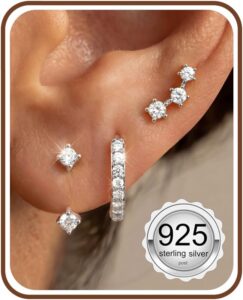 FIASASO 3 Pairs Sterling Silver Stud Hoop Earrings Set for Women Teen 925 Sterling Silver Cartilage Earrings Stud Earring Huggie Earrings Set