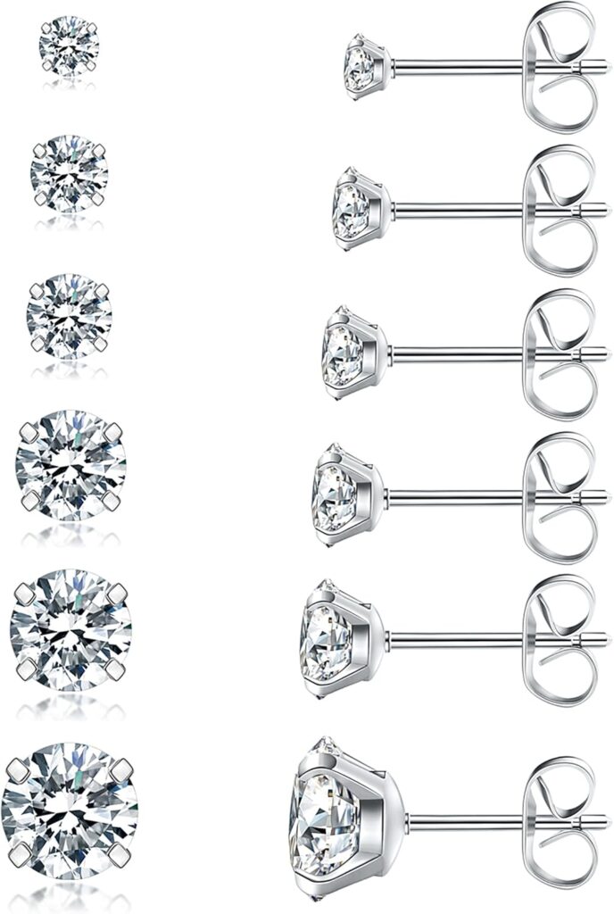 6 Pairs Stud Earrings Set, Hypoallergenic Cubic Zirconia 316L Earrings Stainless Steel CZ Earrings 3-8mm