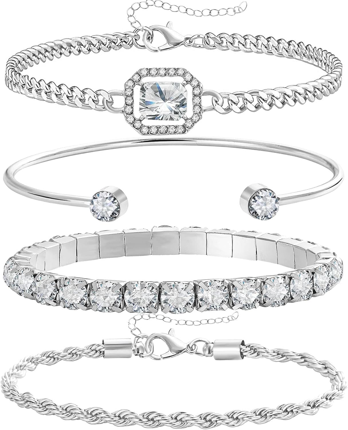 17IF Dainty Gold Silver Bracelets Set for Women Girls 14K Plated Link Cubic Zirconia Paperclip Stake Layering Chain Adjustable Trendy Hand Jewelry 4 Pcs