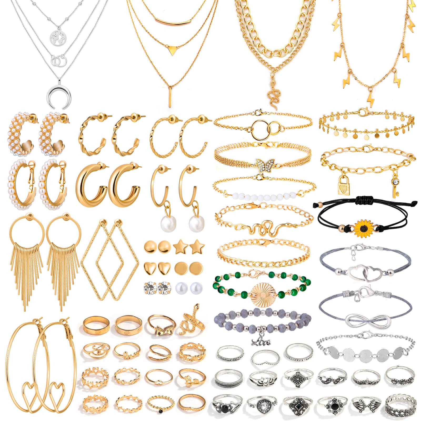 FEYIR 72 Pcs Jewelry Set for Women Costume Jewelry Necklace Bracelet Stackable Rings Earrings Pack for Women