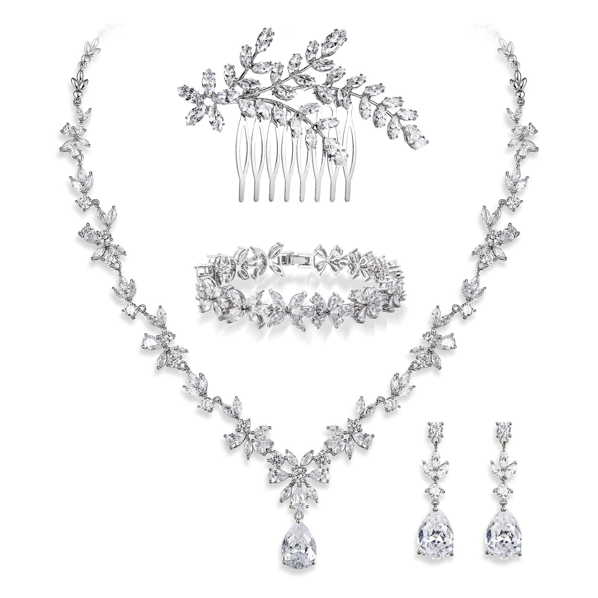 Crysdue Wedding Jewelry Set for Women, Floral Leaf Vine Teardrop Necklace Dangle Earrings Bracelet and Hair Comb, Cubic Zirconia Elegant Party Prom Jewellery for Bridal Bridesmaid