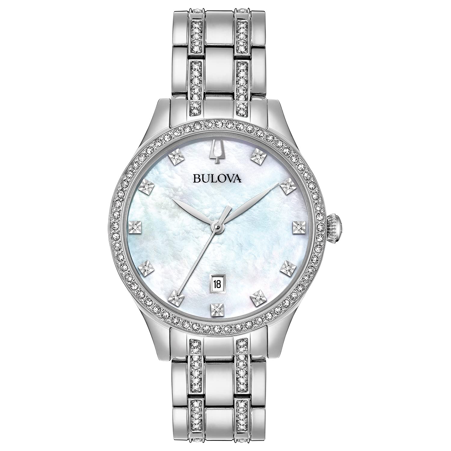 The Bulova Classic Crystal Stainless Steel 3-Hand Quartz Watch stands out with its mother-of-pearl dial.