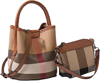 AIJCOR Tote Bag for Women, Leather Plaid Bucket Shoulder Bag Top Handle Canvas Crossbody Handbag Designer Classic Purse