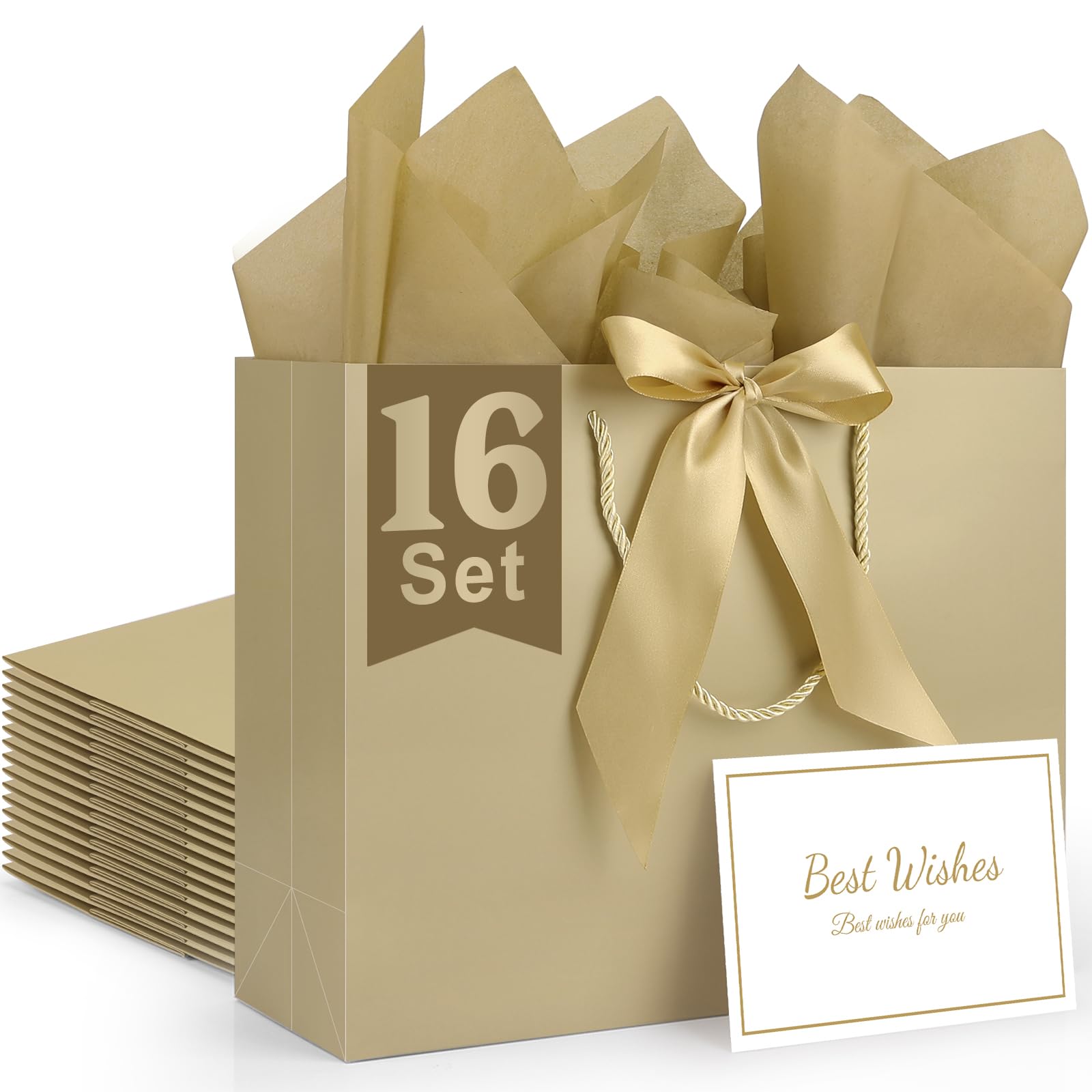 TUXIYA Gift Bag, 16PCS 12.6″ x 9.8″ x 4.3″ Champagne Gift Bag with 16 Ribbon and 16 Greeting Cards 32 Tissue Paper, Large Gift Bags Wedding Gift Bags Present Bags for Birthday Valentines Party Birthday Mothers Day