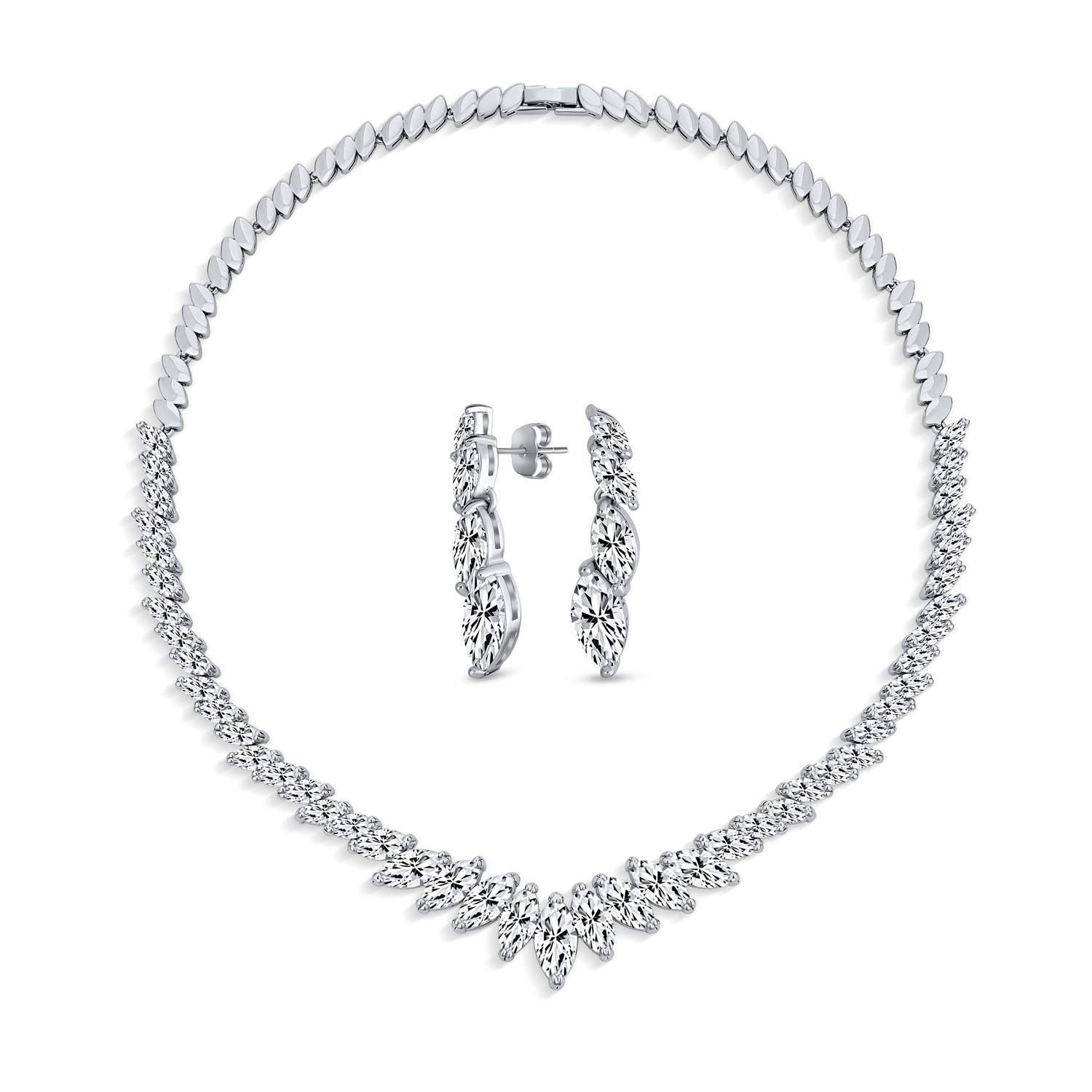 Bling Jewelry Bridal Jewelry Set Art Deco Vintage Estate Style Cubic Zirconia Marquise Leaf Teardrop AAA CZ Statement Cleavage Choker Necklace & Chandelier Dangle Clip On Or Pierced Earrings For Women Pageant