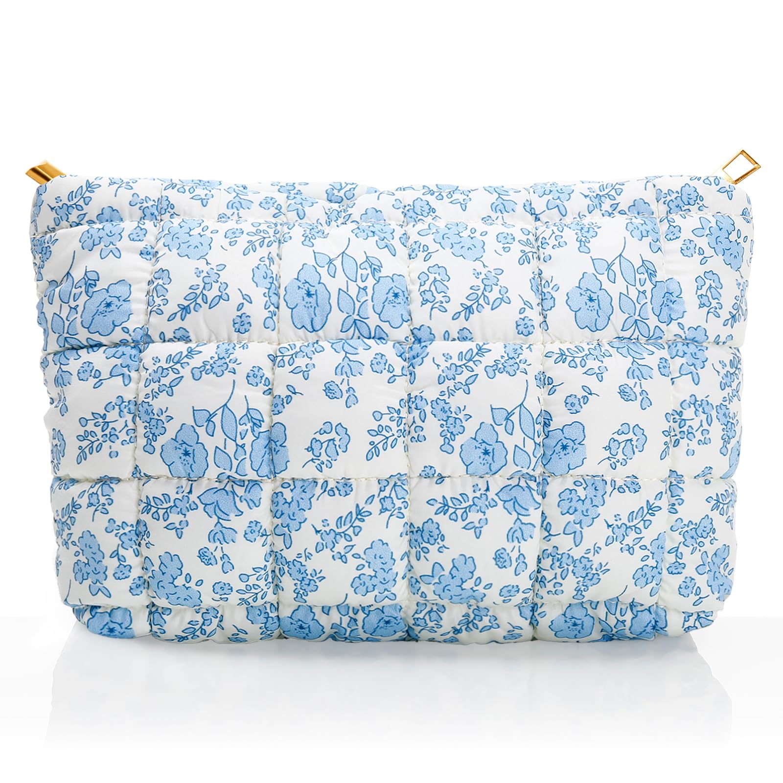 Hillban Blue Floral Puffy Quilted Makeup Bag Quilted Cosmetic Bag Cute Winter Puffer Gift for Women Toiletry Checkered Pouch Aesthetic Travel Makeup Brushes Organizer(Classic)