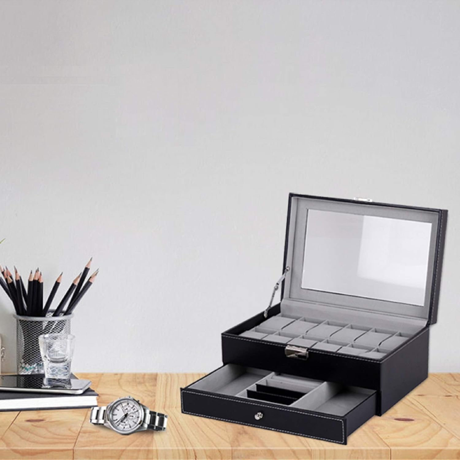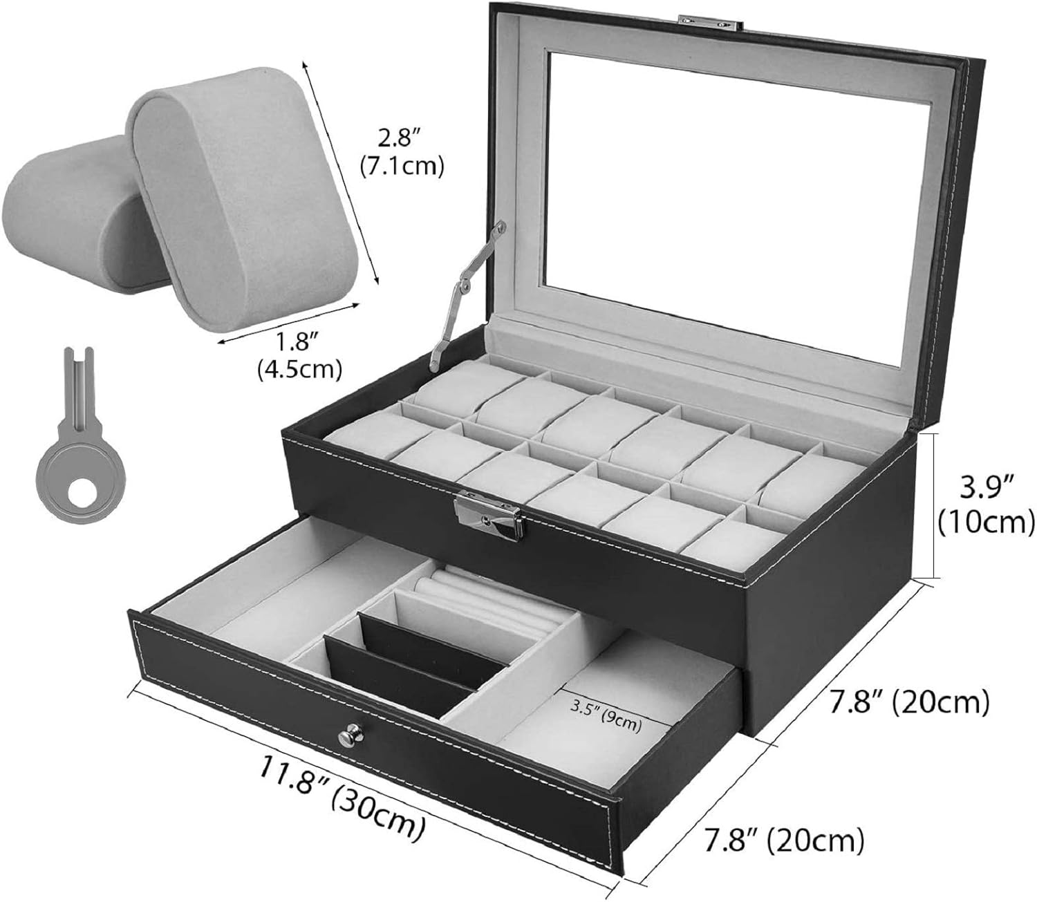 12-Slot Watch Box, Watch Display Storage Box, Leather Watch Organizer, Clear Lid Watch Box, Lockable Watch Storage Case, Watch Box with Jewelry Drawer, 2 Layers Watch Case for Men & Women, Black