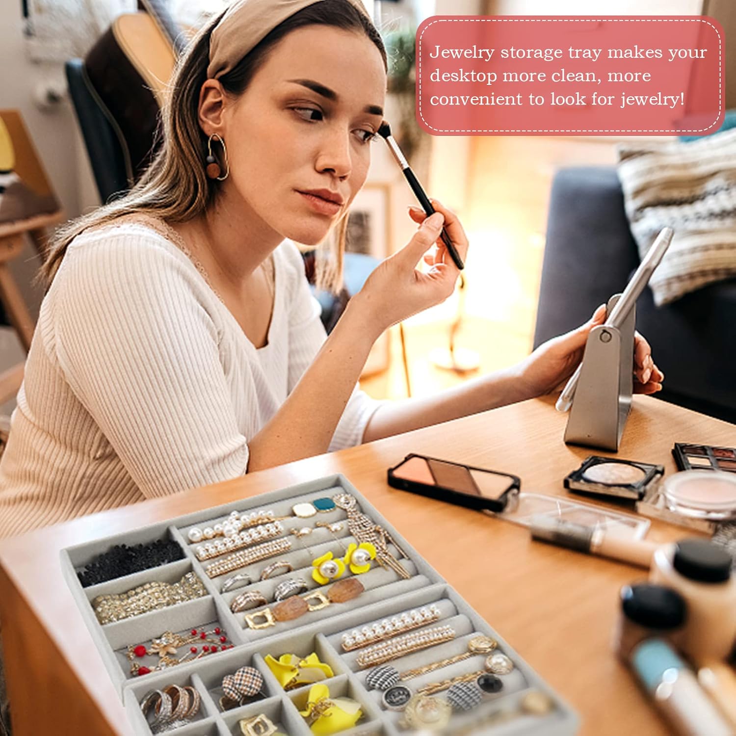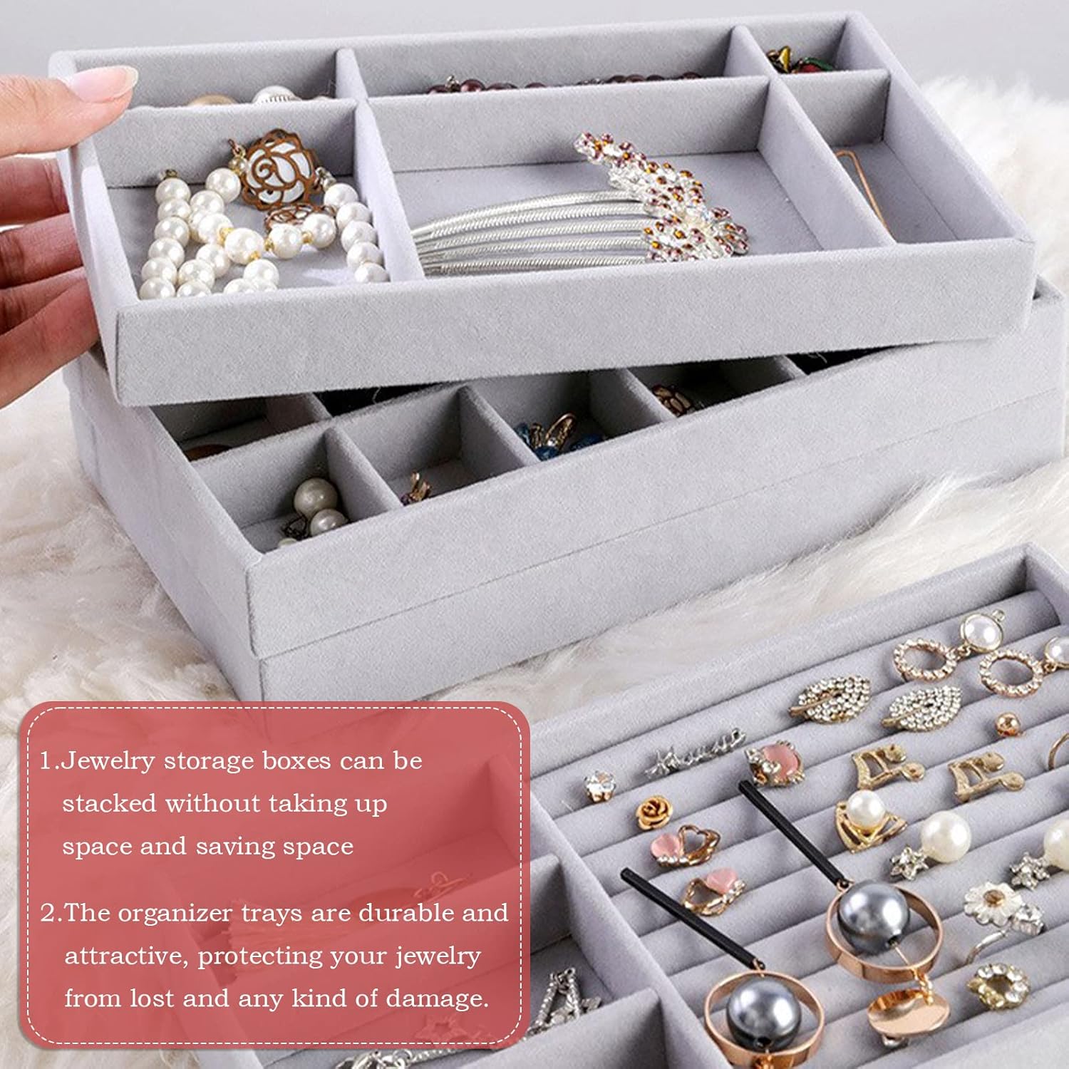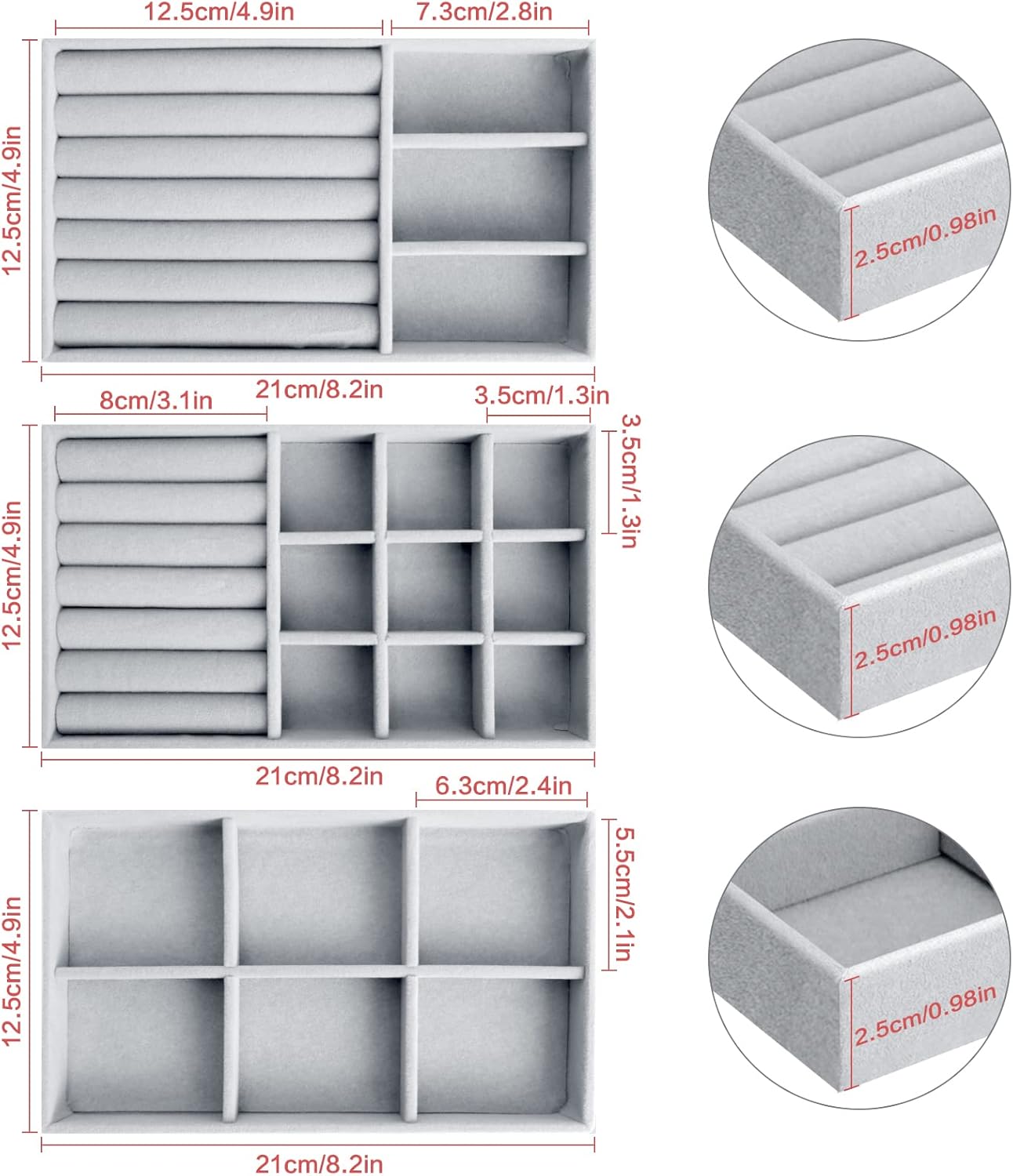 3 PCS Jewelry Organizer Trays Jewelry Drawer Storage Display Tray Stackable Velvet Jewelry Case for Rings Necklace Bracelet Brooch Watch (8x5x1inch, Gray)