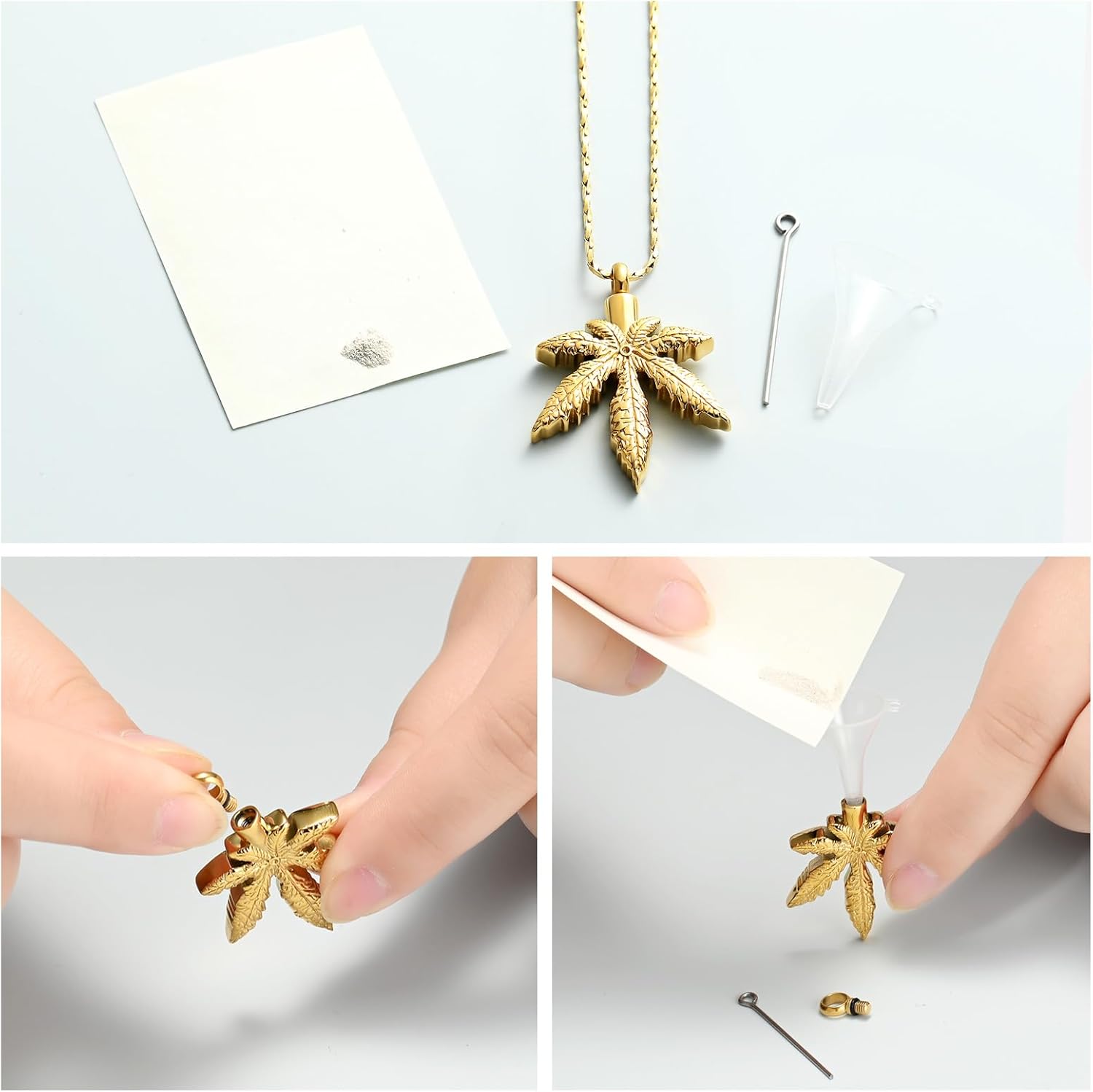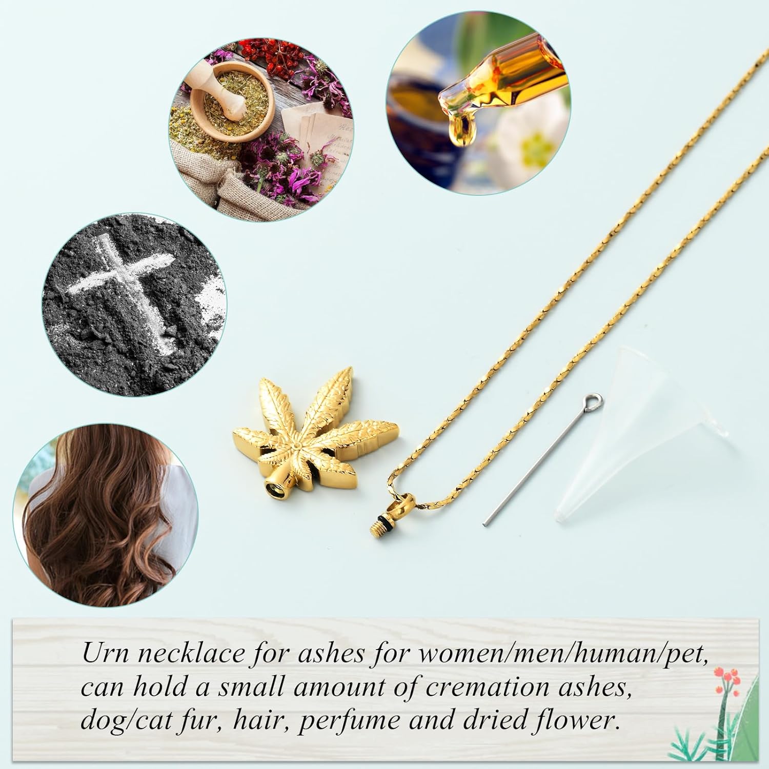You can place a small amount of human or pet ashes, pet fur, dried flowers, perfume, or essential oils inside the pendant.