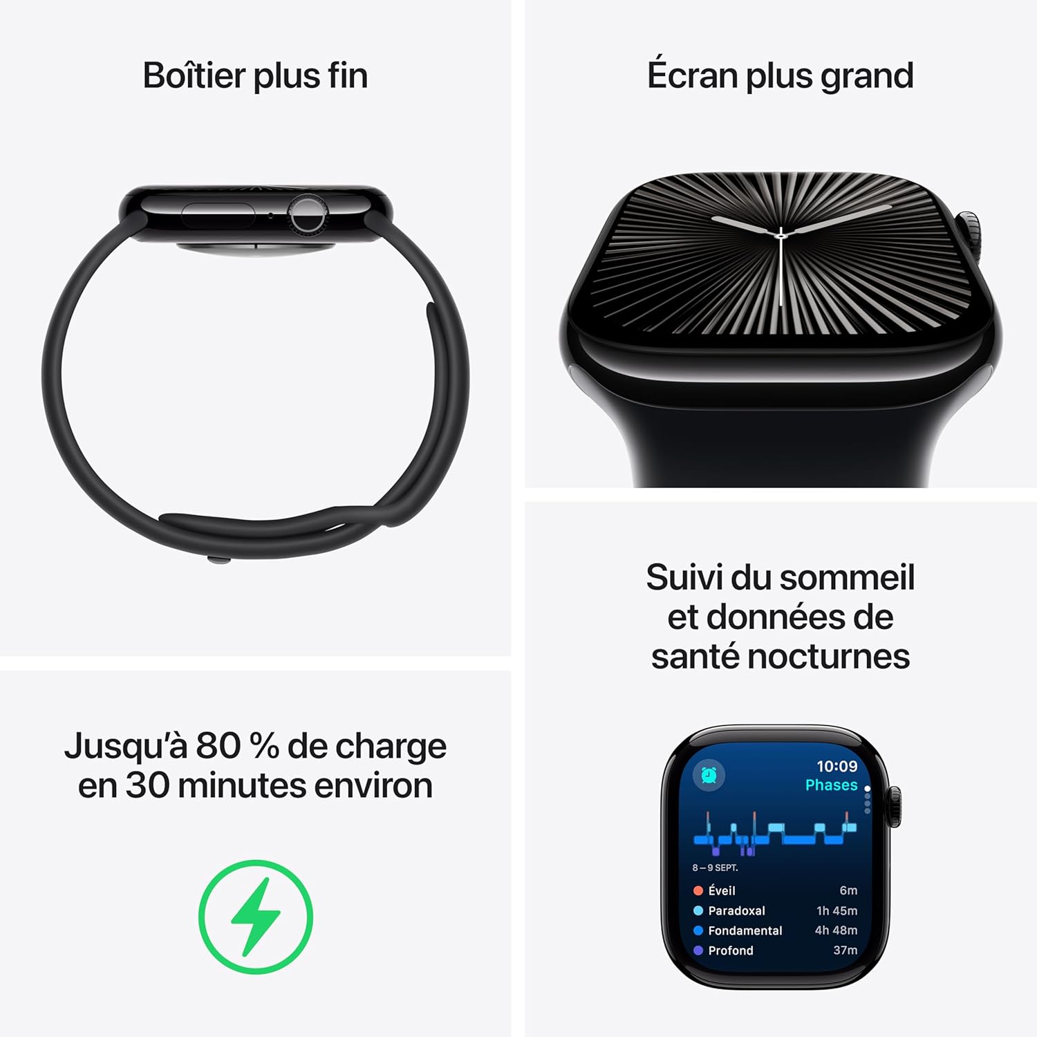 WHY APPLE WATCH SERIES 10—Bigger display with up to 30 percent more screen area.* A thinner, lighter and more comfortable design.* Advanced health and fitness features provide invaluable insights.* Safety features connect you to help when you need it.* Faster charging gives you 80 percent battery in about 30 minutes.*