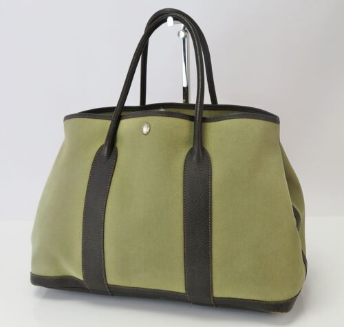 Auth HERMES Garden Party Khaki Canvas and Leather Tote Bag Purse #59728