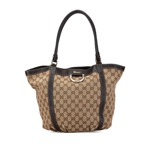 The Gucci GG Abbey D Ring Tote is made from brown beige canvas fabric.