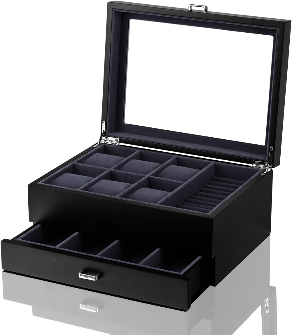 Dimension: The Watch & Jewelry Box measures 28.1 cm in length, 21.2 cm in width, and 13.2 cm in height. Its compact size makes it convenient to place on your dresser, nightstand, or wherever you choose to keep your jewelry within easy reach.