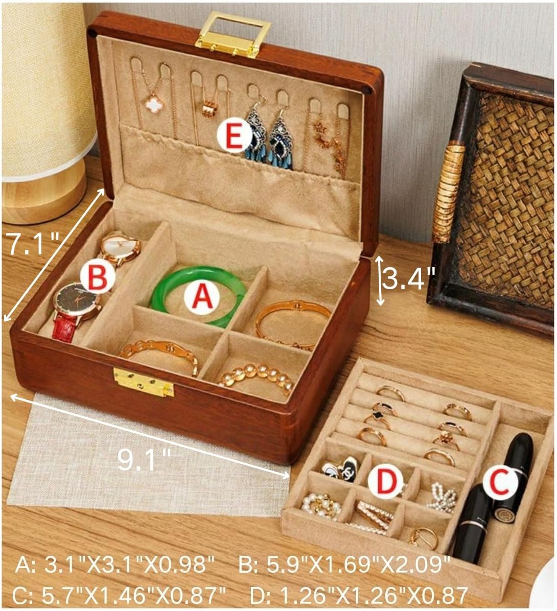 Bescott 2 Layer Solid Wooden Jewelry Box with Lock and Key for Women Men Vintage Velvet Wood Jewelry Organizer Storage for Earrings Rings Necklaces Bracelet Watch Mother’s Day Gift