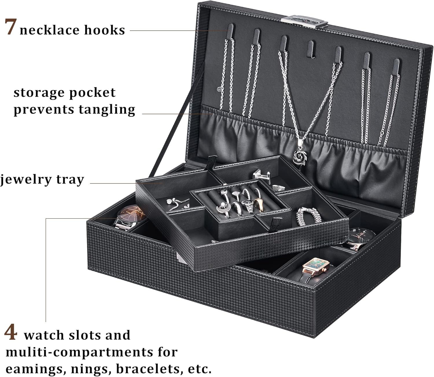 WATCH & JEWELRY COMBO CASE: Holds 4 watches; 7 necklace holder hooks hold 8-9 of necklaces and pendants; 8 large compartments in 2 layers hold lots of earrings, rings, bracelets, cufflinks, etc. 1 storage pocket prevents jewelry from tangling. You will have fun using the watch jewelry box every day and seeing all jewelry well organized and laid out so that you can see everything you own and can wear jewelry more often