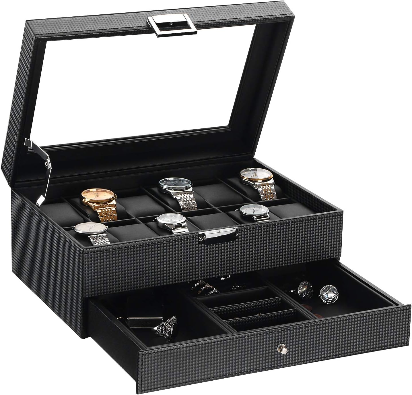 BEWISHOME Watch Box Organizer with Valet Drawer – Real Glass Top, Adjustable Tray, Metal Hinge, Carbon Fiber Design – 12 Slots Watch Storage Case for Men, Black SSH02C