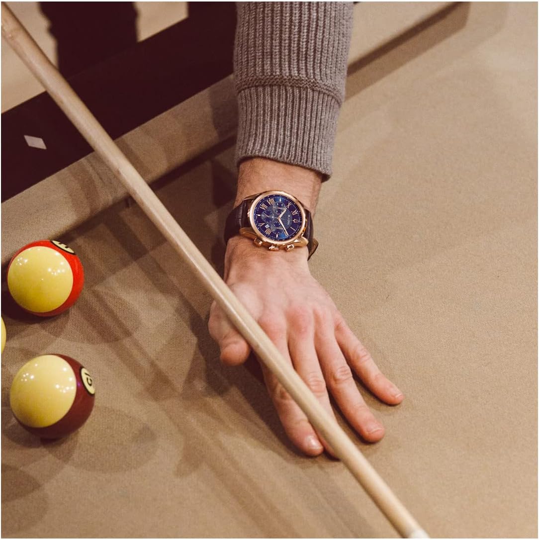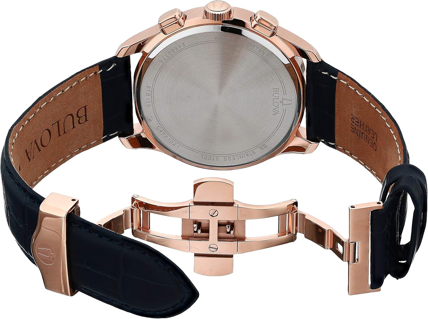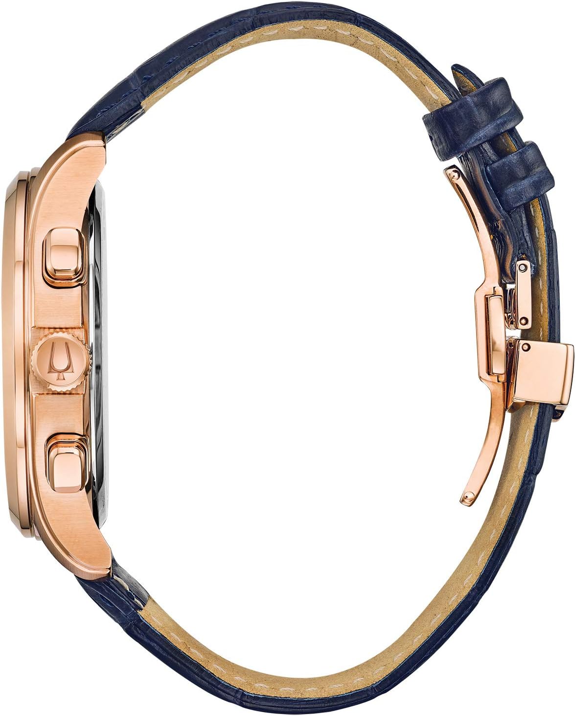 From the Classic Collection. New Wilton style with six-hand chronograph function. Rose gold-tone stainless steel case with applied Roman markers, tachymeter and calendar feature on dark blue textured dial, domed mineral glass, croco-embossed blue leather strap with double-press deployment closure, and water resistance to 30 meters.
