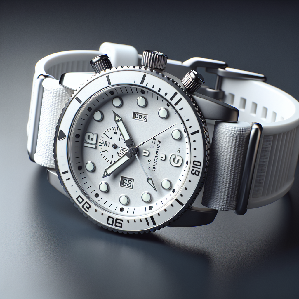 White watch featuring gold-tone accents, date window at 3 o’clock, and bi-directional rotating bezel 33 mm resin case and mineral dial window Japanese quartz movement with analog display Ribbed resin band with buckle closure Water resistant to 100 m (330 ft): In general, suitable for swimming and snorkeling, but not scuba diving
