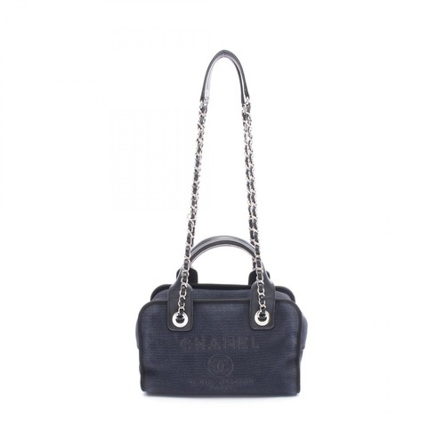 CHANEL Deauville bowling chain Shoulder Bag canvas leather Navy Black Used SHW