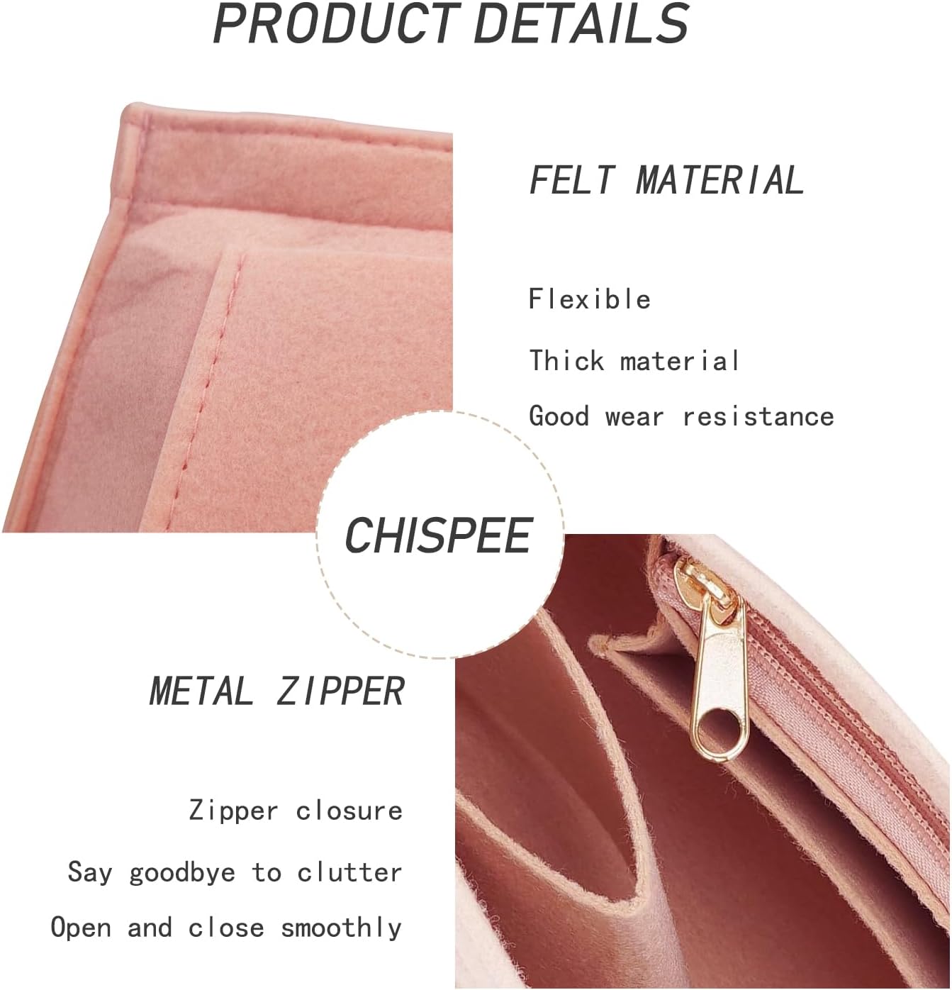Chispee Felt Purse Organizer Insert Luxury Handbag Organizers for Longchamp Divider Pocket & Zipper Inner Bag Liner fit Small, Pink