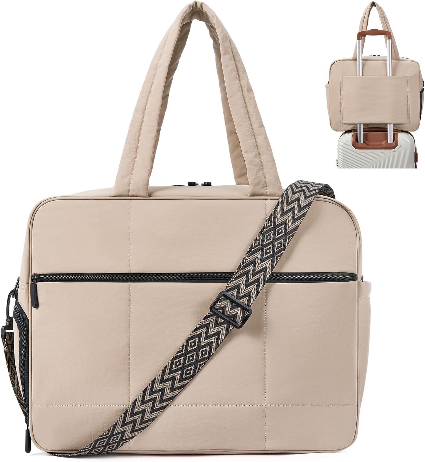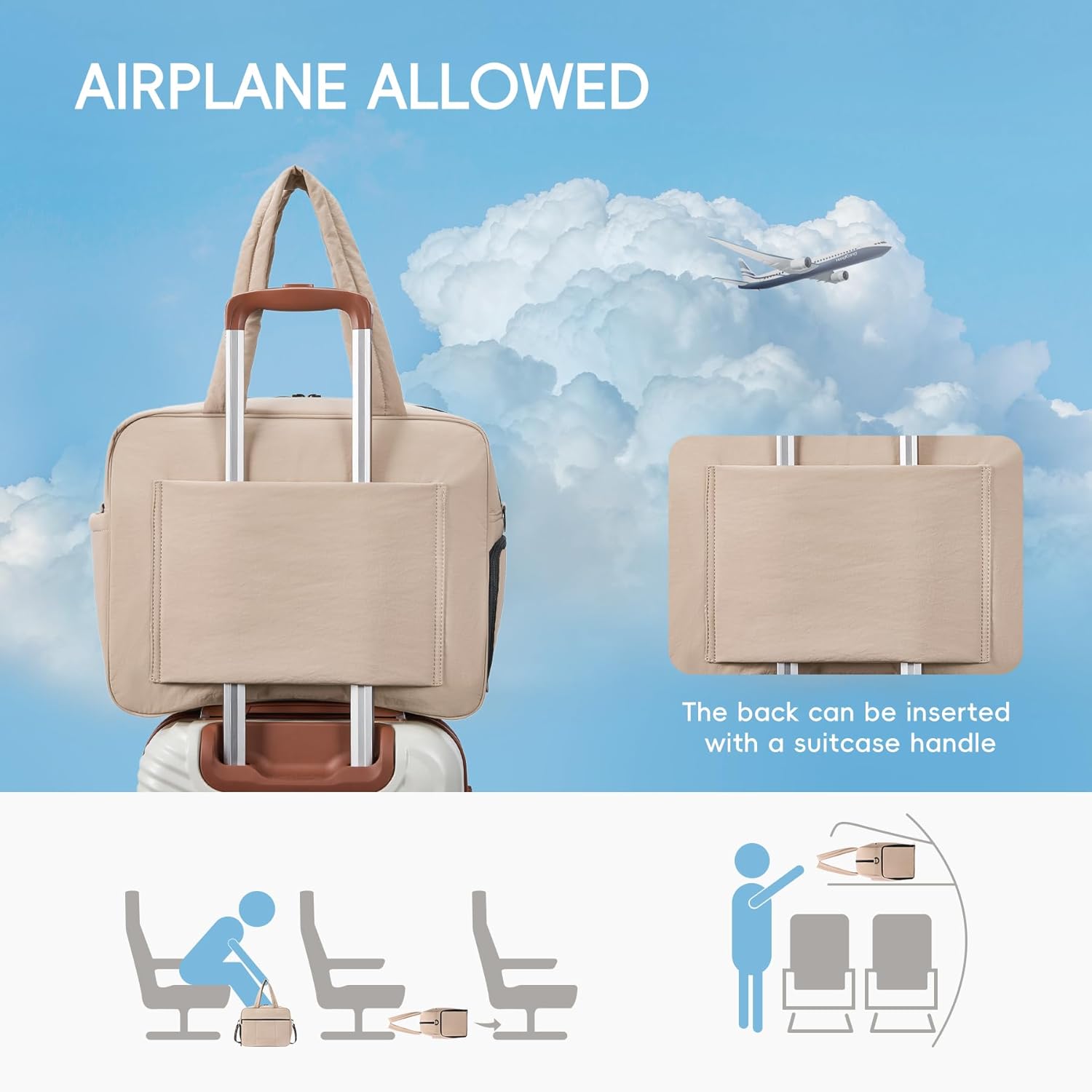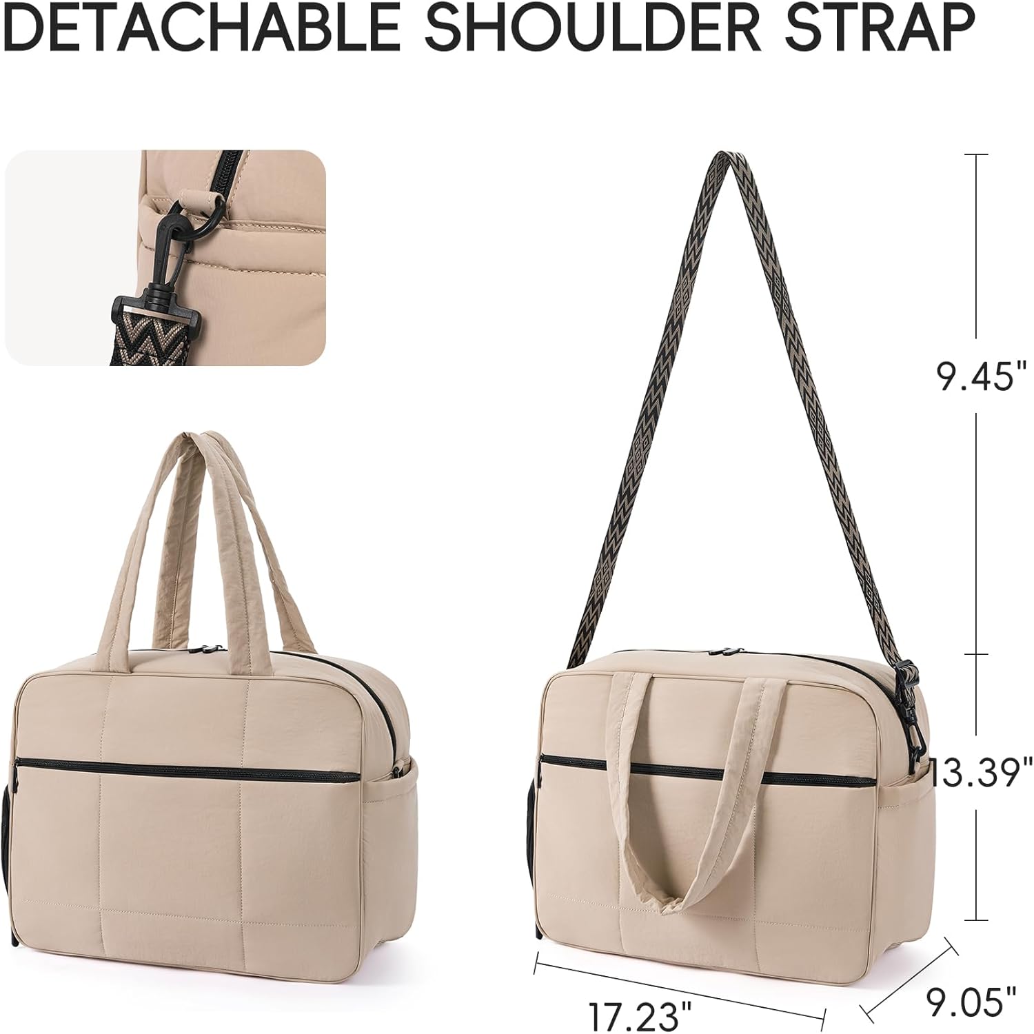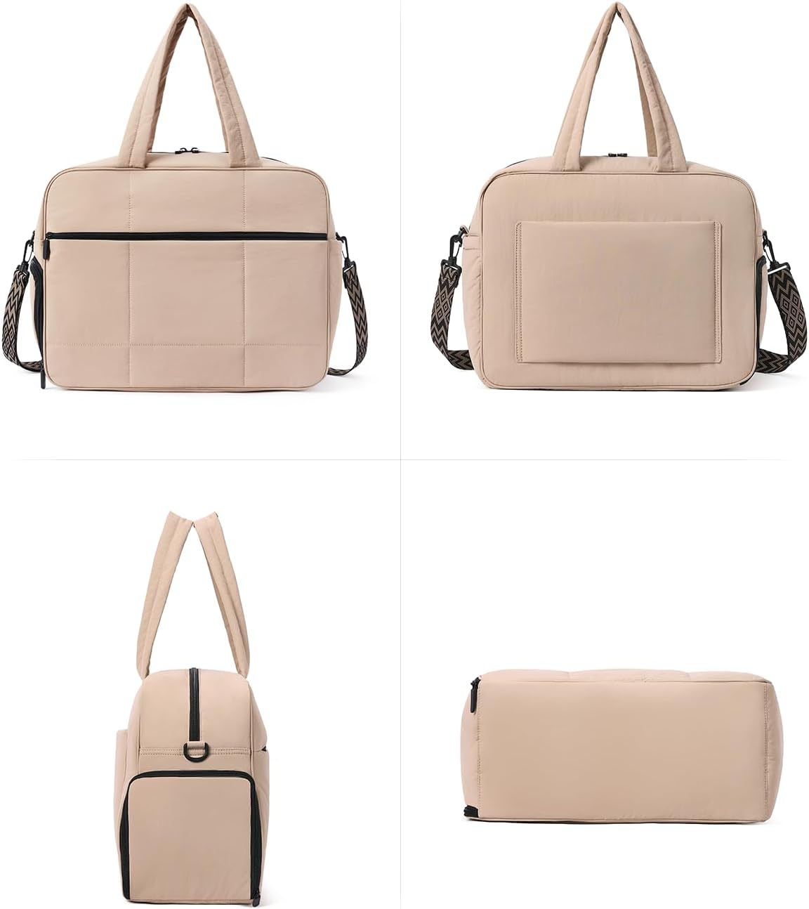 【Large Capacity】17.23(L)*13.39(W)*7.09(H) inches, handle drop is 9.45″, long strap is 15.55″- 27.95″ (adjustable). This puffer bag contains 1 main compartment, 2 inner insert pockets, 1 inner zipper pocket and 1 front zipper pocket, 1 side pocket and 1 shoe compartment. It fits your laptop, toiletry bag, or other daily essentials, and is perfect for your carry on when traveling. Also it is worth mentioning that the size of this bag conforms the flight requirements for carry on luggage.