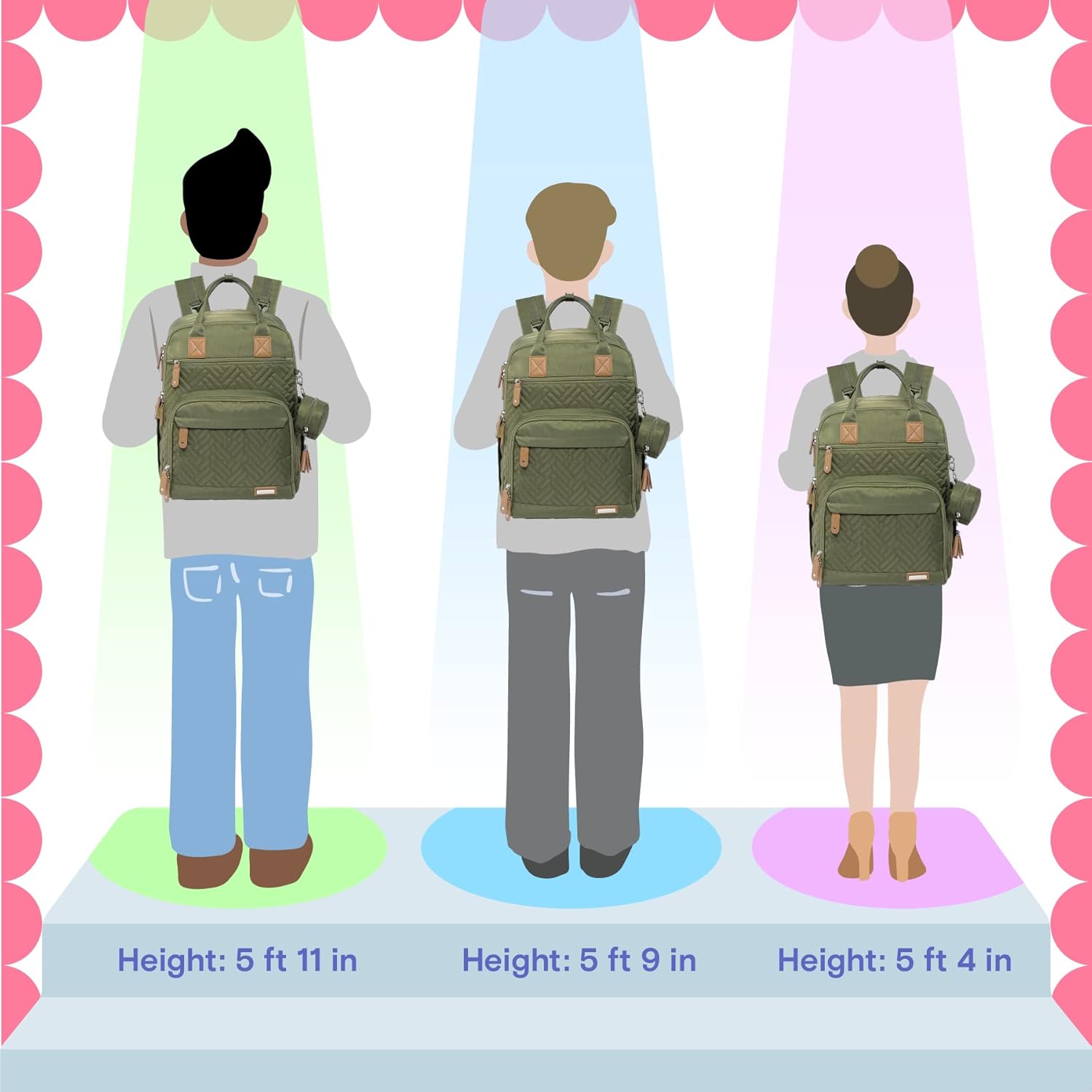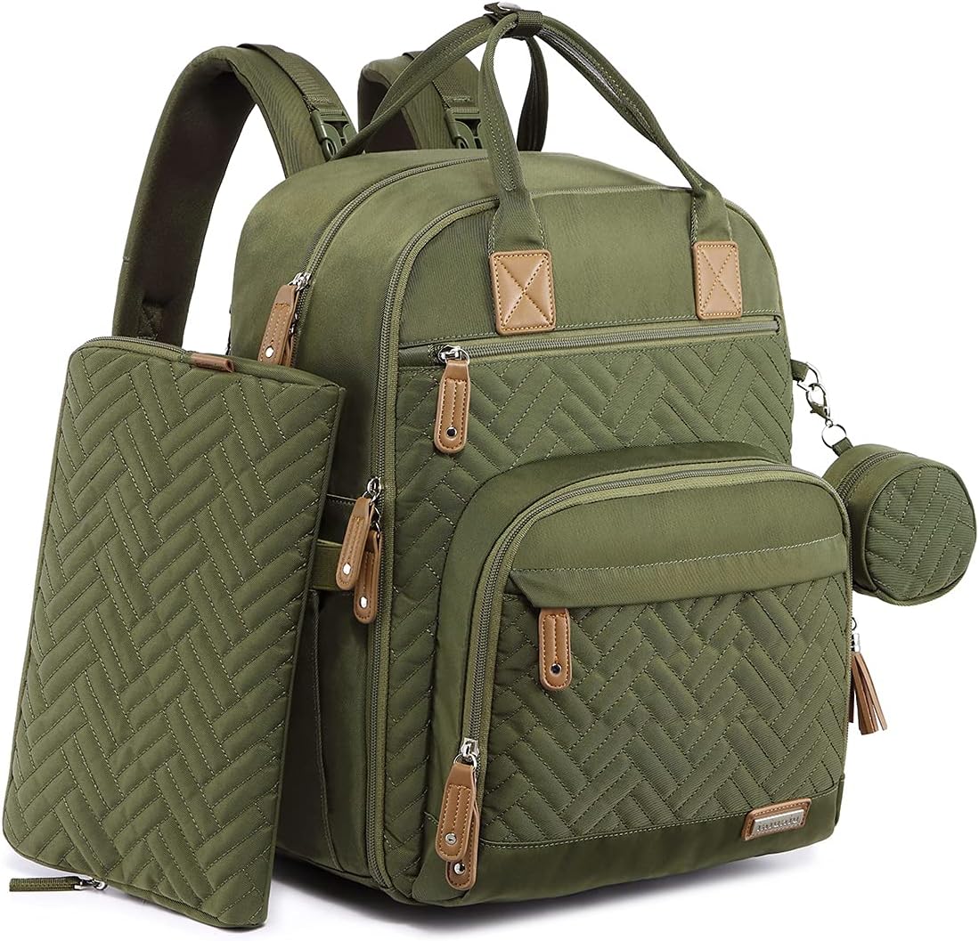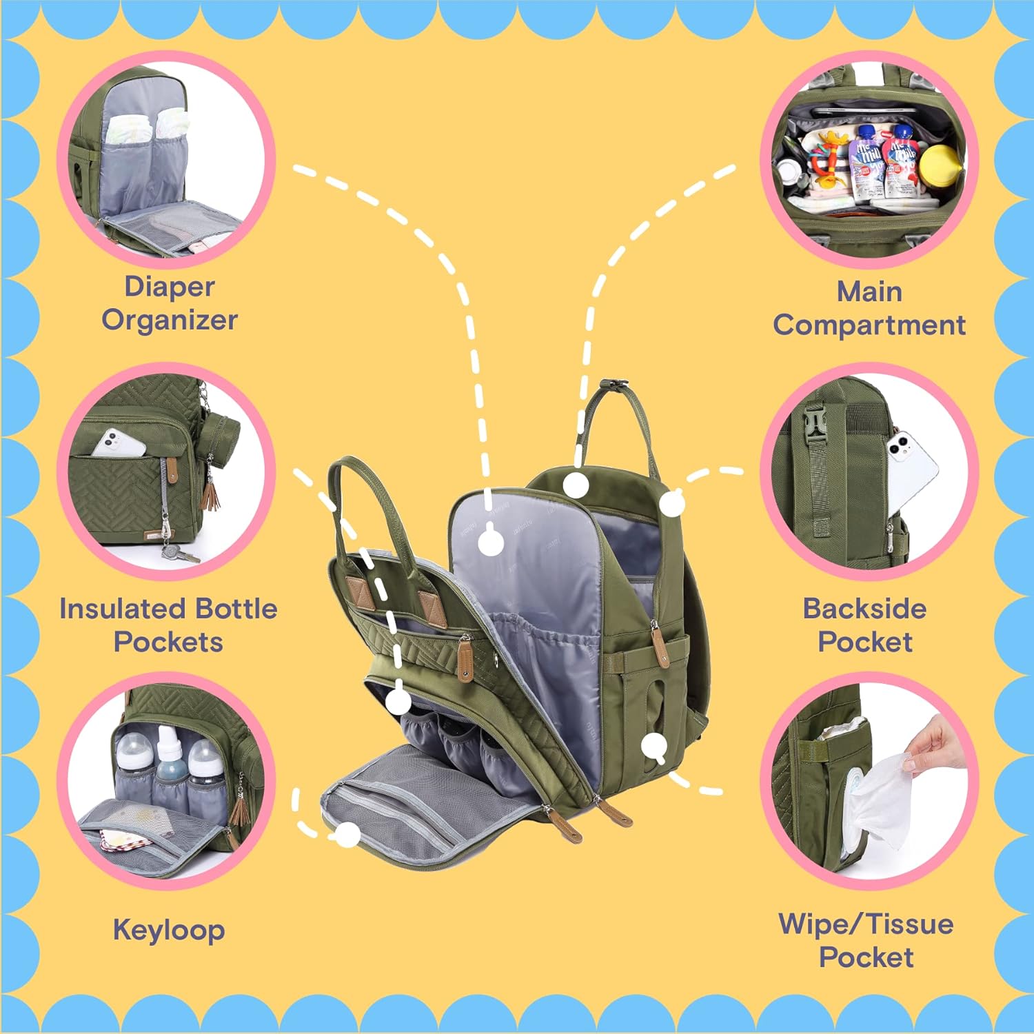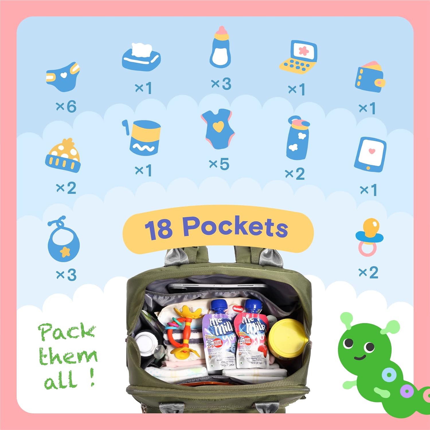 Large and wide, roomy enough to fit all your baby stuffsWater-resistant outer material and wipeable inner liningAdjustable backpack straps and grab-and-go top handleConcise neutral style make it fashionable for Dad & MomIncluded 3 insulated pockets to fit all major baby bottle brandsMultiple compartments to keep diapers and wipes within reach