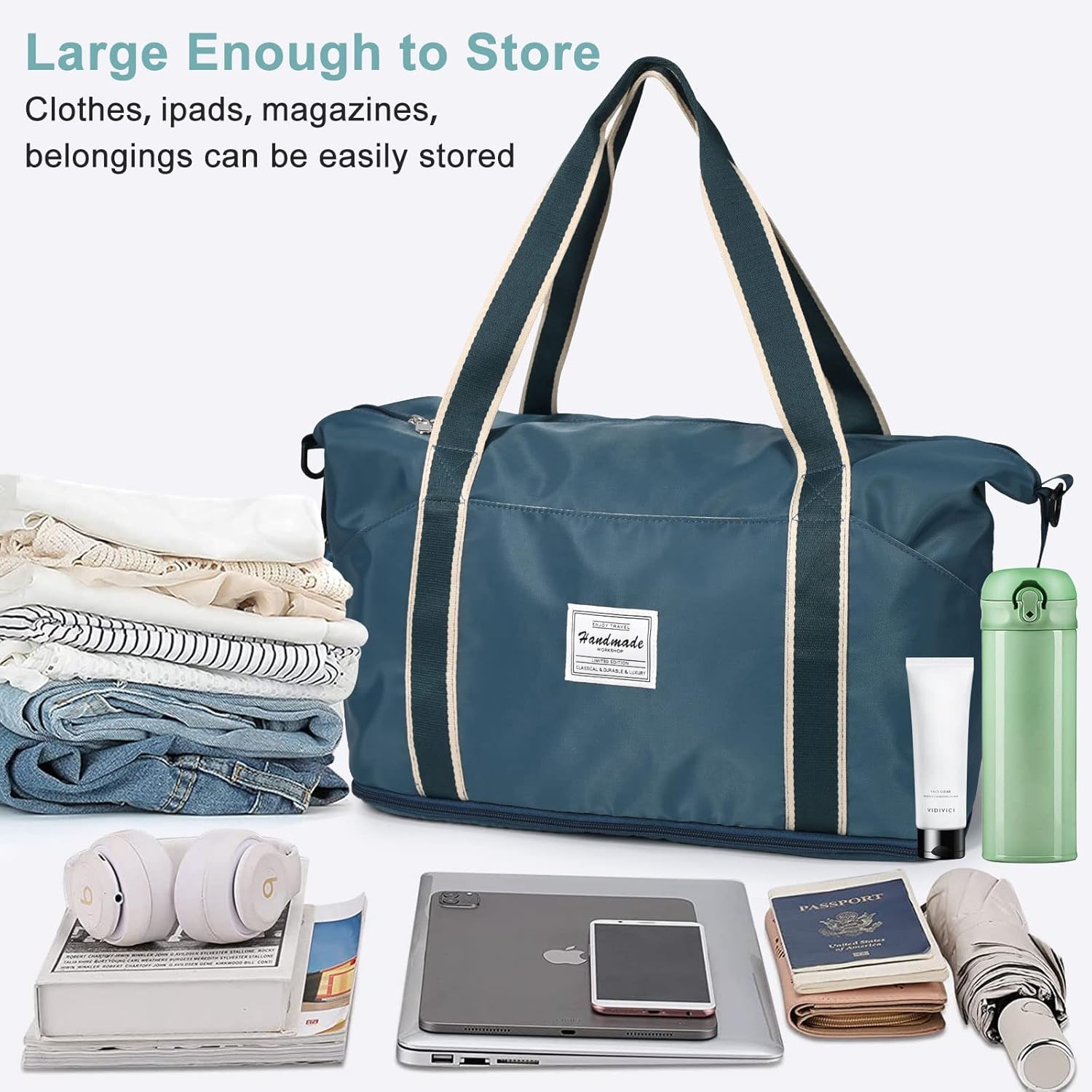 Customers appreciate the duffel bag for its spacious interior with ample pockets and room for daily essentials like clothes, chargers, and other items. They find it well-made and durable, able to hold up to 17 pounds of weight without issue. The size is suitable for medium carry-on luggage and can be expanded or folded for extra space. Customers appreciate the nice style and consider it a great complement to their carry-on suitcase. The bag is easy to carry and use as a travel bag or beach bag.