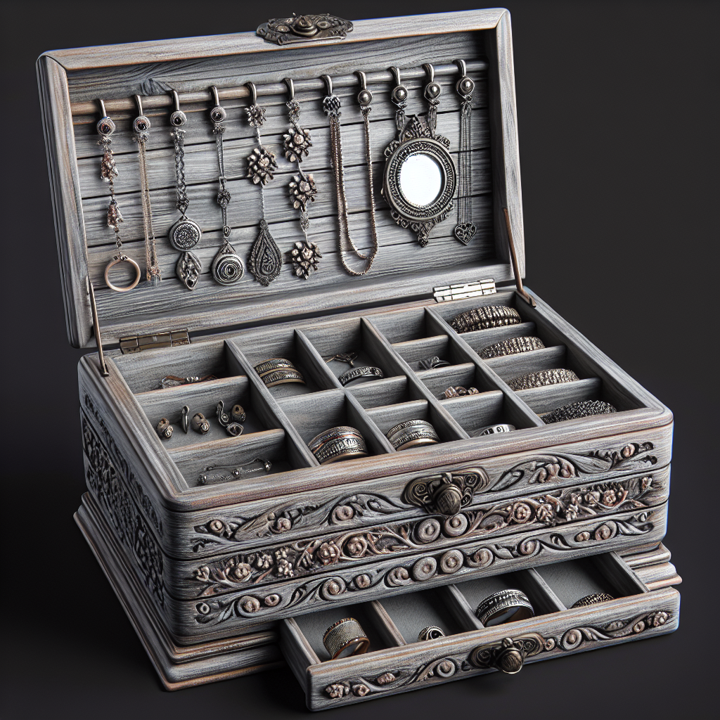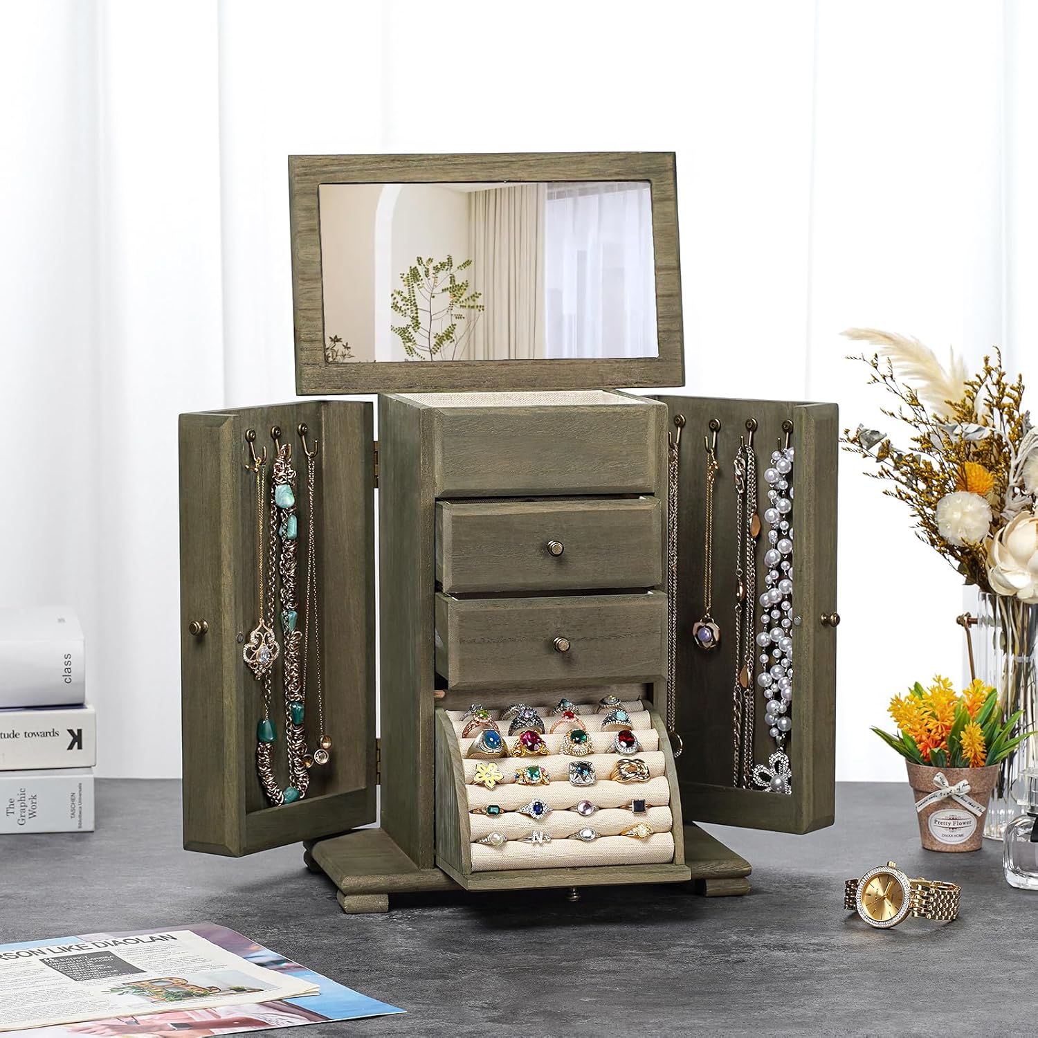 💝Collect All Beauty: Every lady has the experience of losing jewelry, do you? This large jewelry box is finish with weathered gray color and double doors—but it also totes everything you need to store a modern jewelry collection. 4 Layer different compartments store different jewelry, such as earrings, bangles, rings and other accessories. 2 side doors of jewelry boxes for hanging necklaces and bracelets.