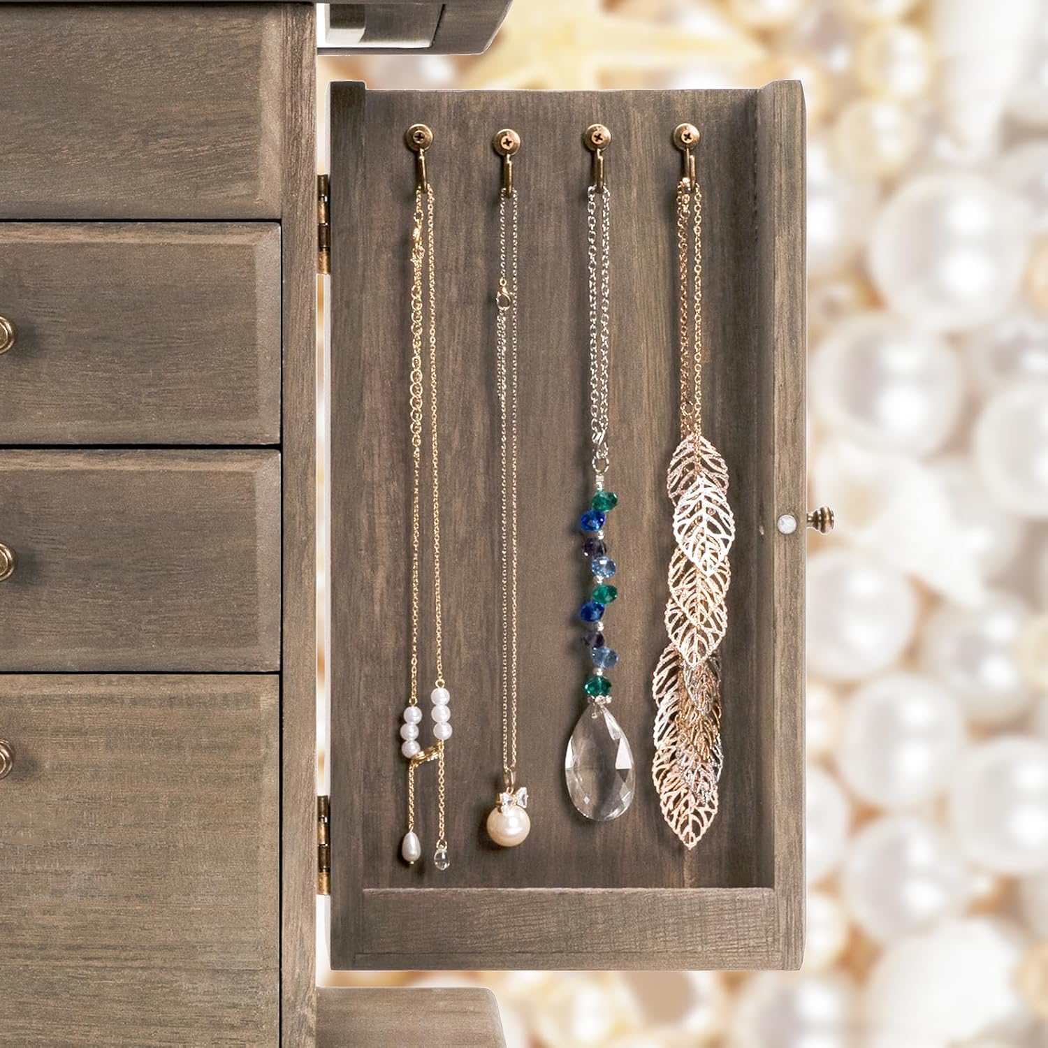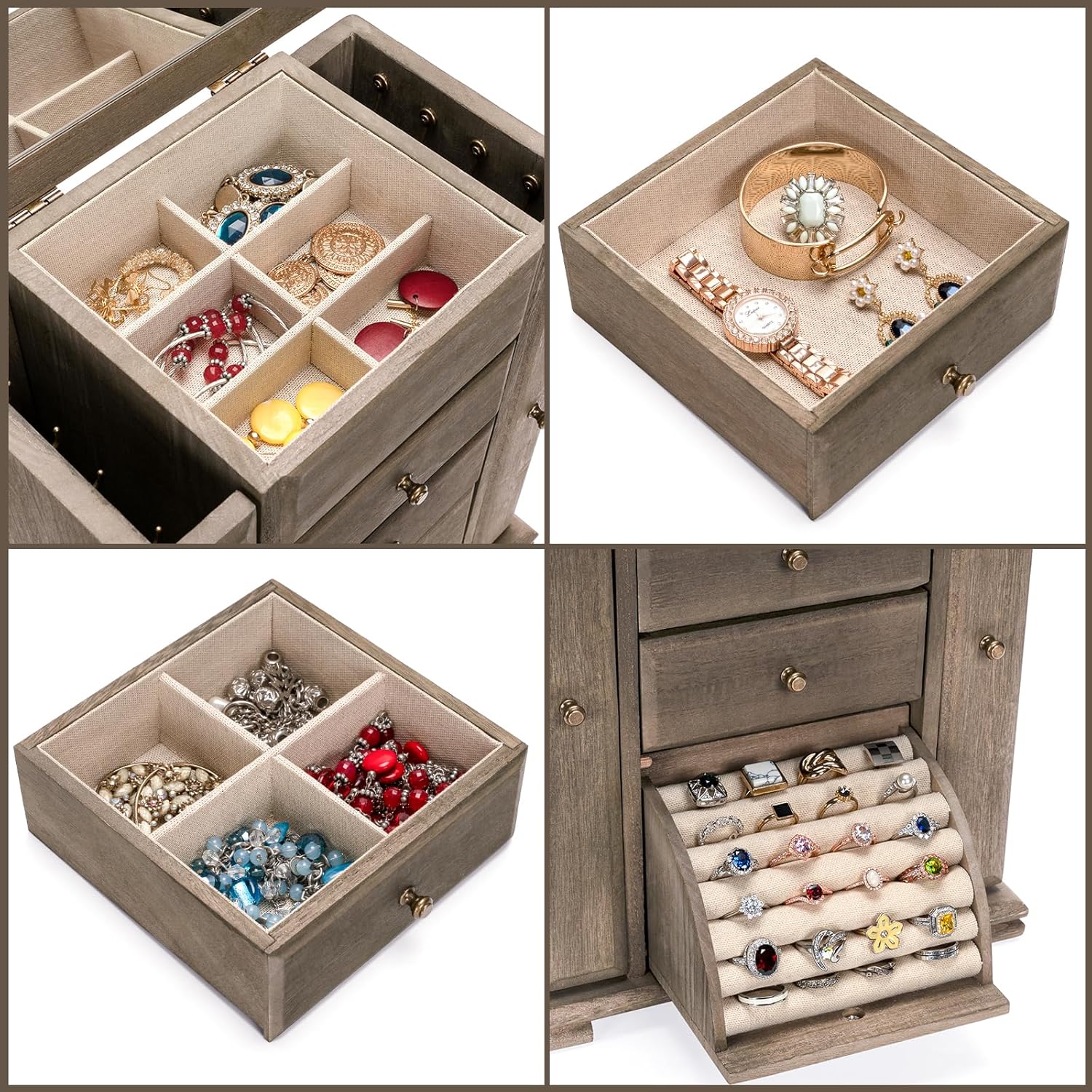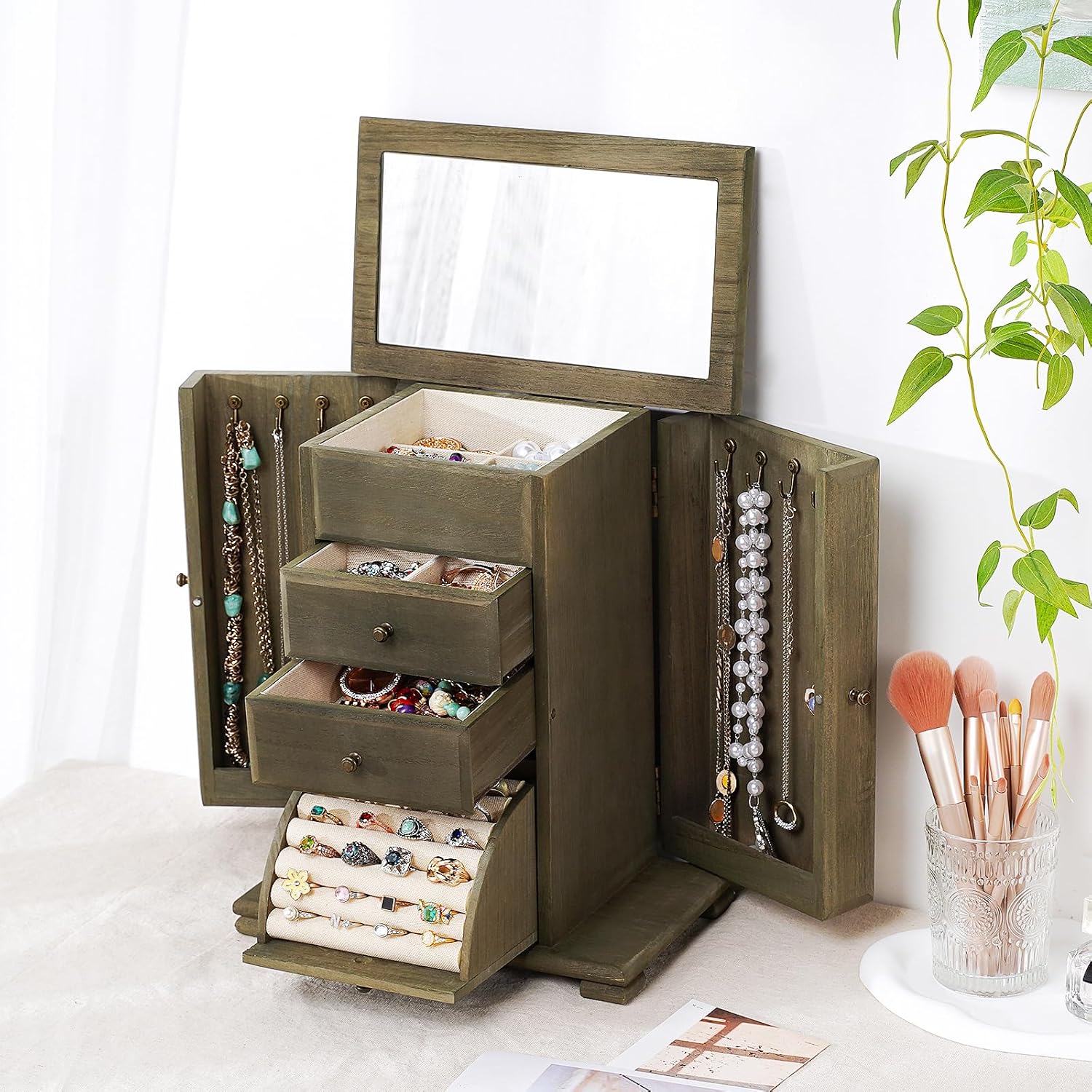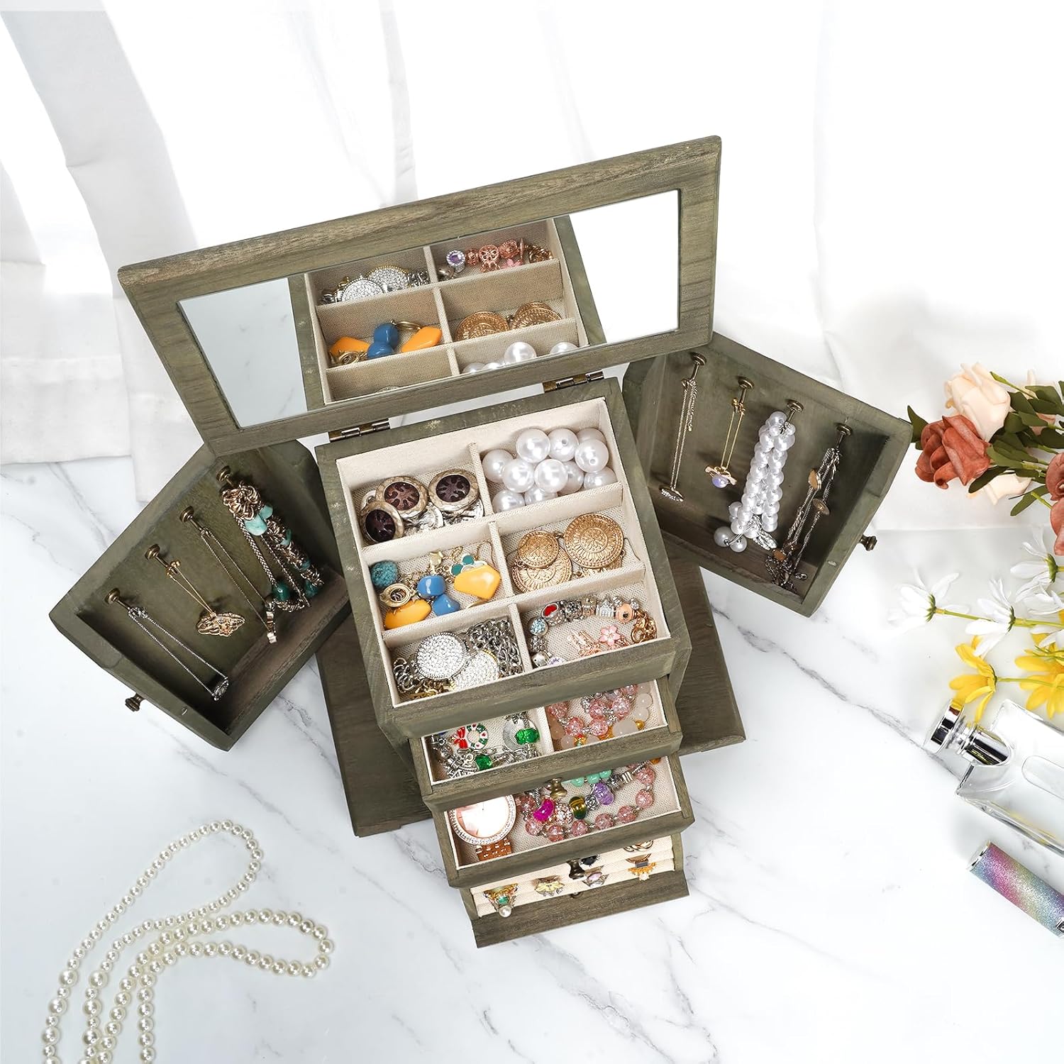 Emfogo Jewelry Box for Women, Rustic Wooden Jewelry Boxes & Organizers with Mirror, 4 Layer Jewelry Organizer Box Display for Rings Earrings Necklaces Bracelets (Weathered Gray)