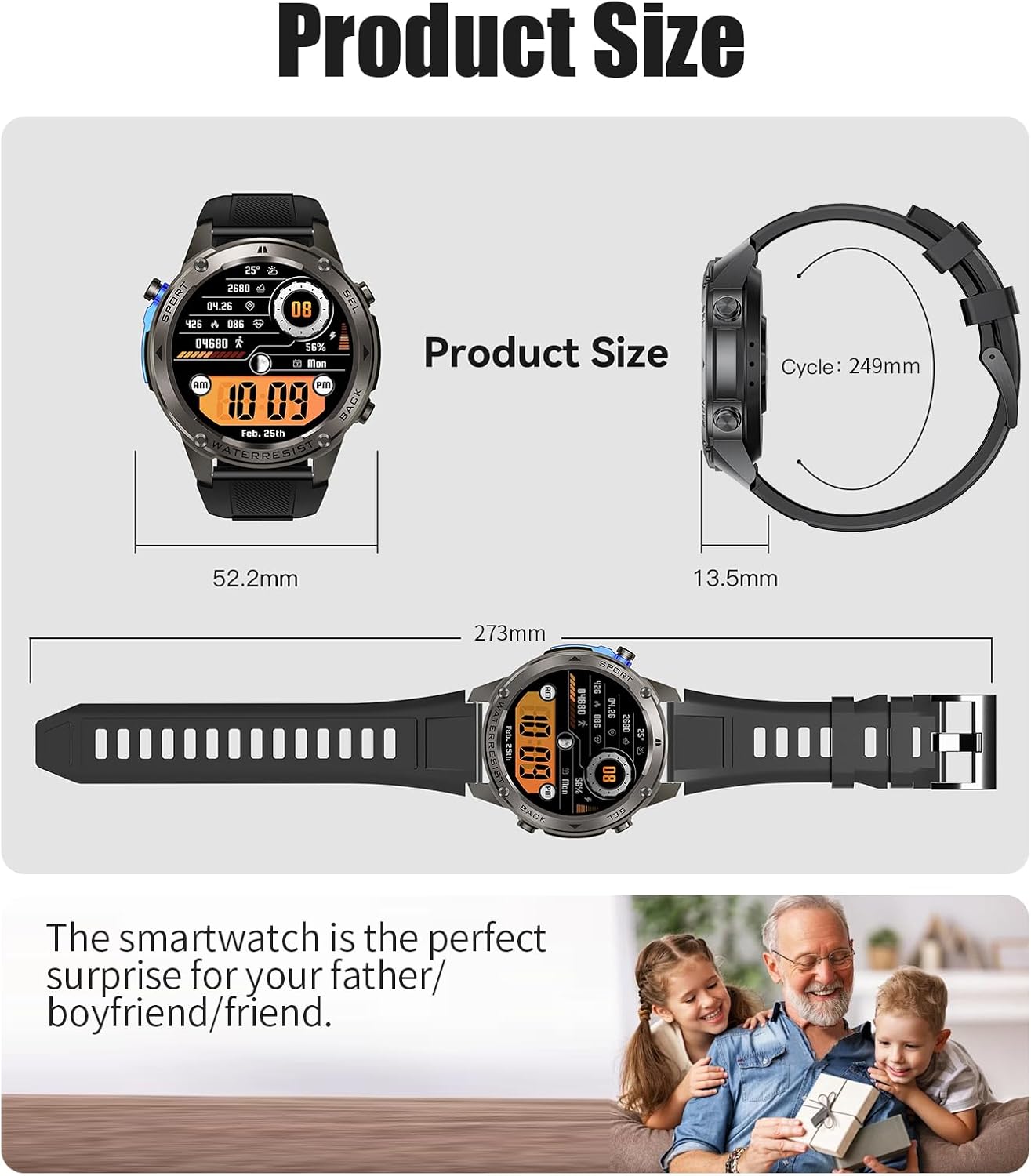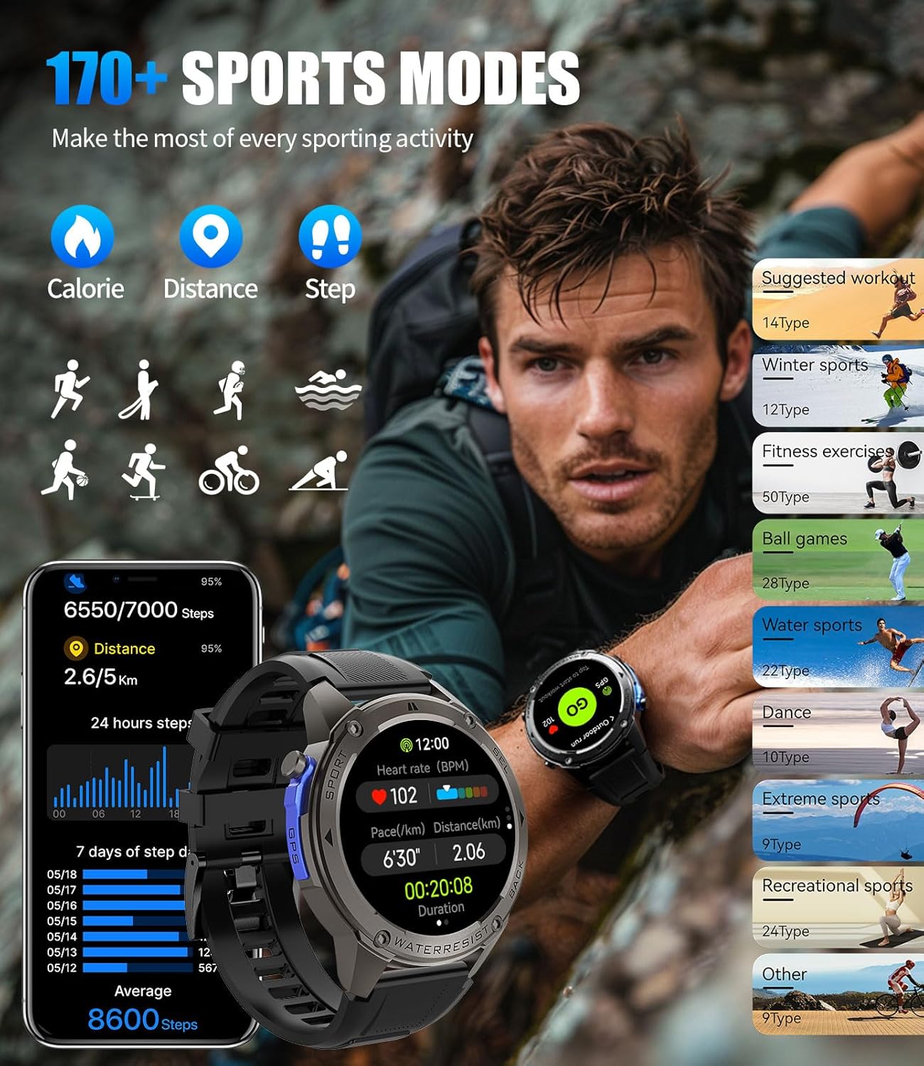 👑 Military-Grade Durability, 5ATM & IP69K Water Resistance – The military smart watch for men features a TC4 aerospace-grade titanium alloy casing combined with a PVD nano-coating, offering exceptional shock resistance, abrasion resistance, and corrosion resistance. The proprietary multi-sealing technology effortlessly achieves 5ATM dynamic water resistance and IP69K static water resistance. The sapphire glass, known for its outstanding hardness and transparency, ensures long-lasting display protection. Built-in electronic compass, altimeter, and barometer sensors allow you to conquer the wilderness while maintaining a clear mind.