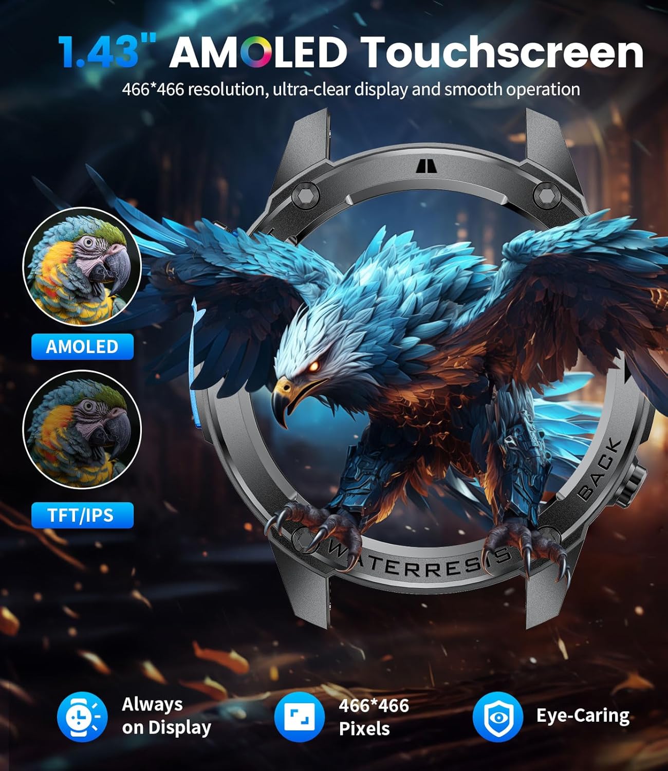 1.43” AMOLED Military Smart Watch with 5ATM/IP69K Waterproof/45 Days Standby(500mAh)/Compass,Altitude,Air Pressure,170+ Sport Modes