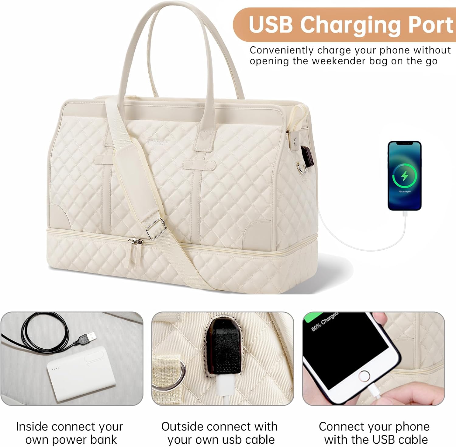 [Large Travel Bag for Women]The travel bag featuring multiple pockets and compartments for stuff organization, roomy space can fit in 3-5 days of travel essentials, easily fit into your clothes, toiletries, shoes, laptop and other items. In the back of the duffle bag there is a pocket for easy access your smart phone, IDs or passport. Equipped a built-in USB charging port, perfect for charging your phone or other devices while Travel