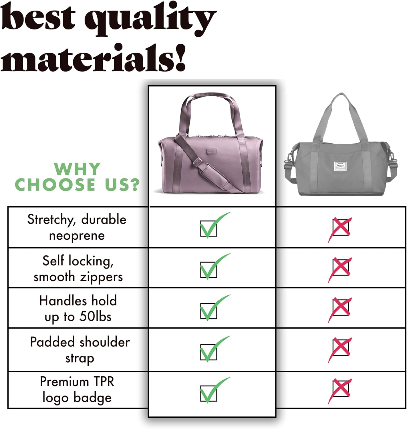 PREMIUM NEOPRENE MATERIAL – Our travel tote bag for women is made of high-quality neoprene material that is stretchy, flexible, water and tear resistant and hand washable. With high quality zippers, this overnight bag is durable and reliable.