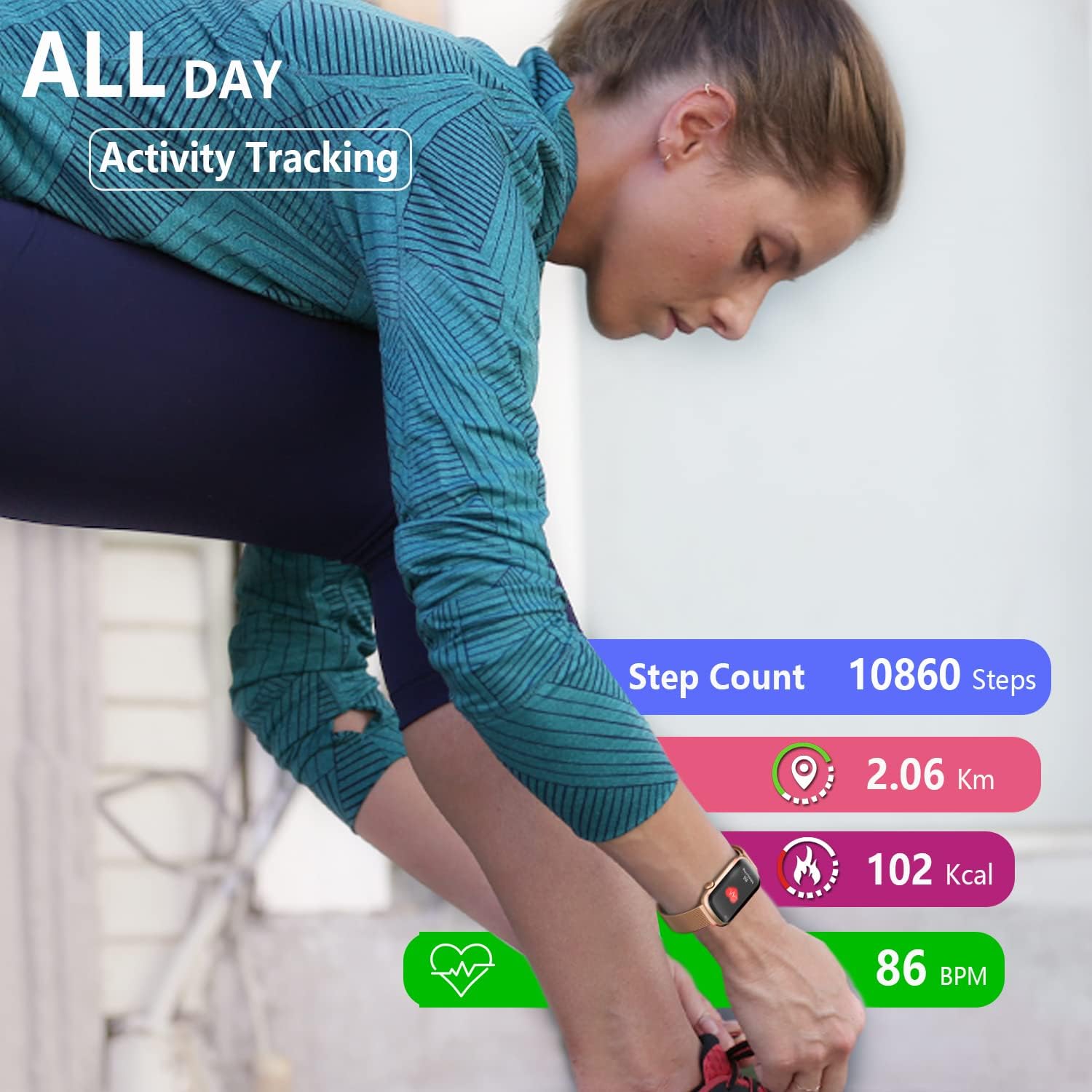 Track all-day activity: Your steps, distance, and calories burned will automatically count and record.
