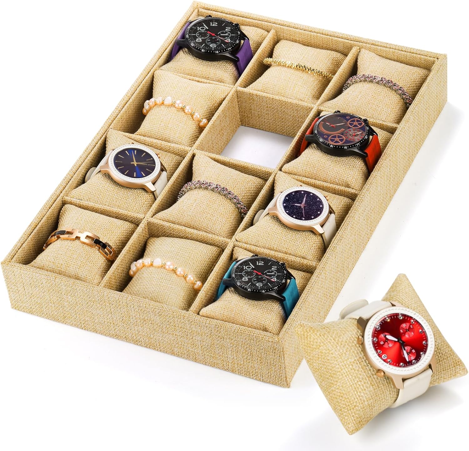 Hedume 12 Slot Sackcloth Watch Tray, Linen Watch Box Display Case Organizer with 12 Pillow