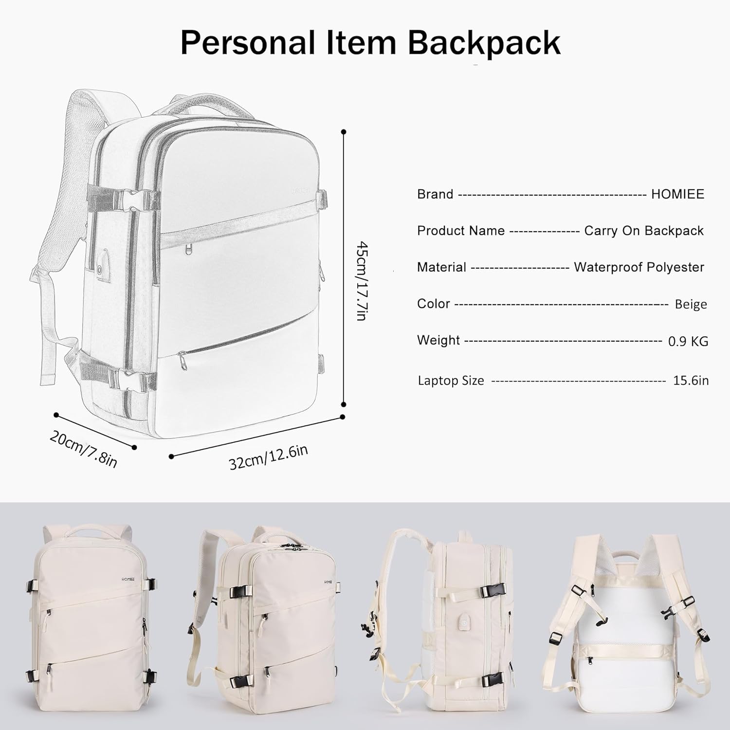 【Multi-compartment Storage】HOMIEE carry-on backpack’s multi-compartment design allows you to keep the contents of your backpack organized while still having a large capacity. Each of the five compartments can be used for different sizes of items, making it easier for you to organize your belongings when you travel. Quick access laptop and tablet compartments can accommodate laptops or tablets up to 15.6″.