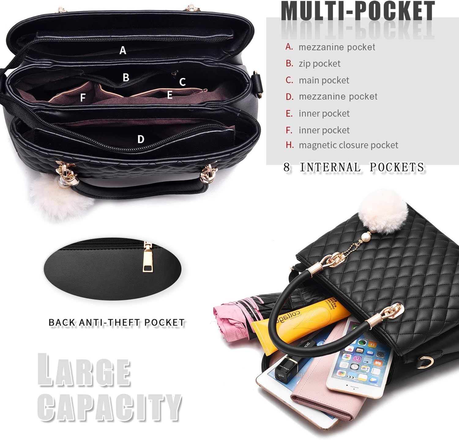 Capacities are large enough to hold your daily necessities when you go outdoors, such us your wallet, cell phone, power bank, make-up. Besides, many pockets inside can help organize your cashes, sunglasses, IPAD MINI and so on