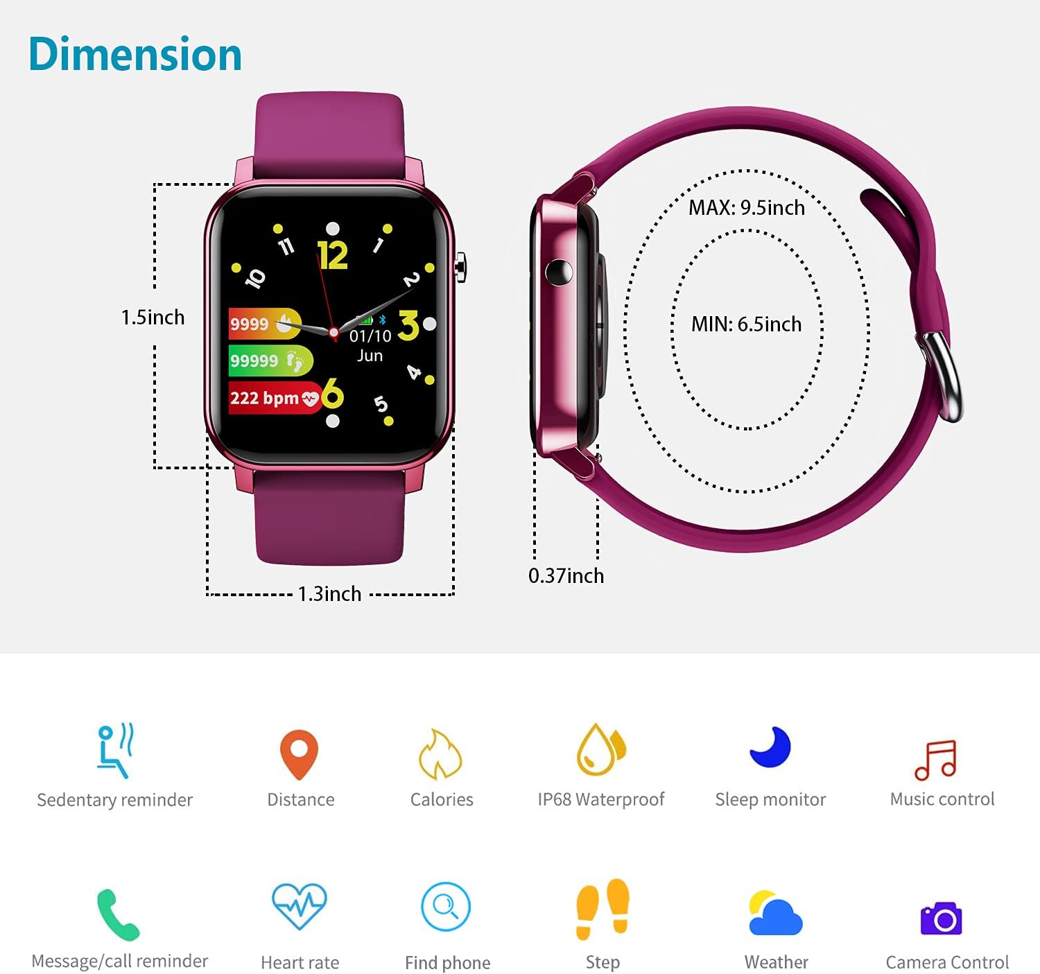 3.This watch counts steps by a built-in 3D gravity sensor, and the step counting result is affected by the user’s swinging arm posture, stride length, body type, road level or slope, and other factors. However, after many trials, the step counting data of our watch will not exceed 10% error from the actual. (If the number of steps is less than 30, it may not be recorded.)