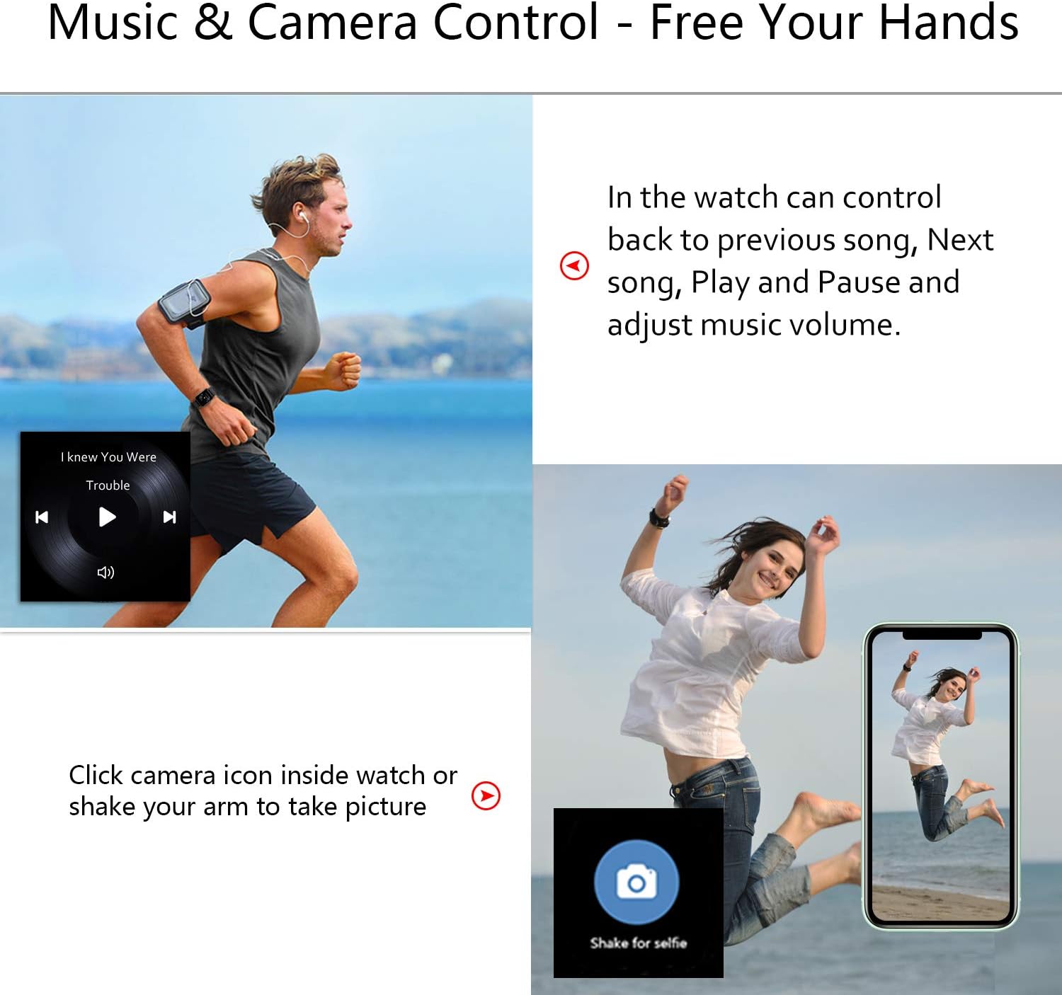 Make it easier to adjust your music when on the go. It can show the song title.Connect to App, Turn on your phone player, In the watch you can control back to previous song, Next song, Play and Pause and adjust music volume.