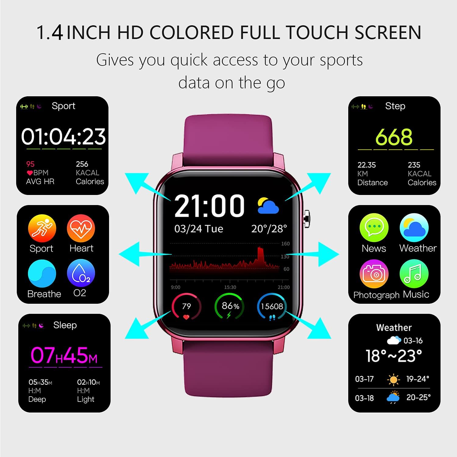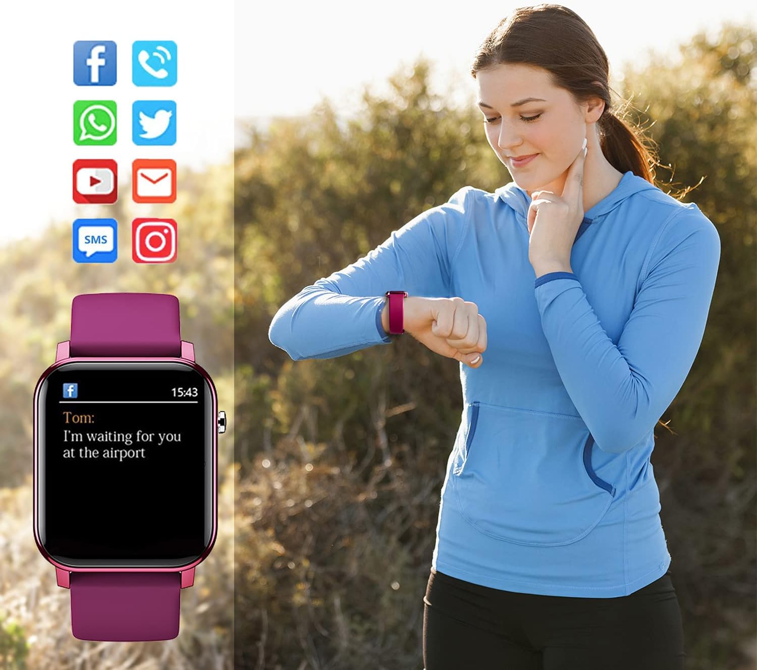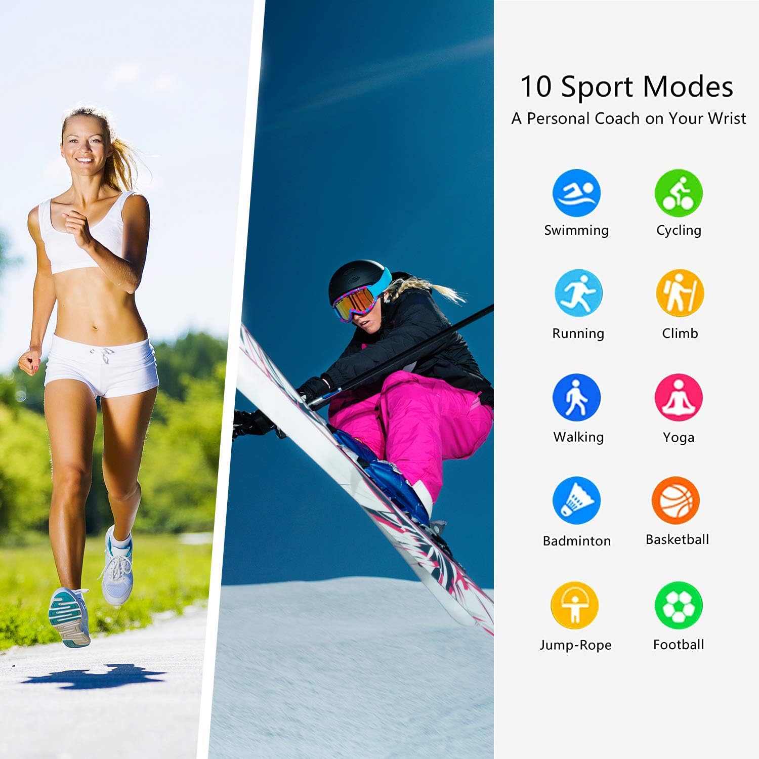 Support 10 Sports mode: Walking, Running, Cycling, Climb, Yoga, Skipping, Badminton, Basketball, Football, Jump Rope.Sleep Monitor: Automatically detect and track your sleep and provide data with deep sleep,light sleep and wake up time.Notifications Reminder : Read the messages directly on the watch (Facebook, Twitter, WhatsApp, Skype, Linkedin and Instagram etc.).