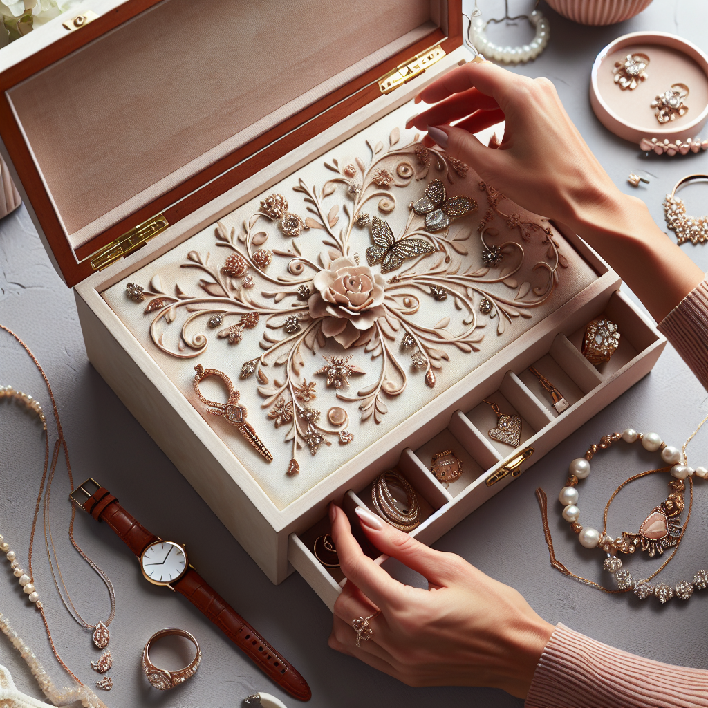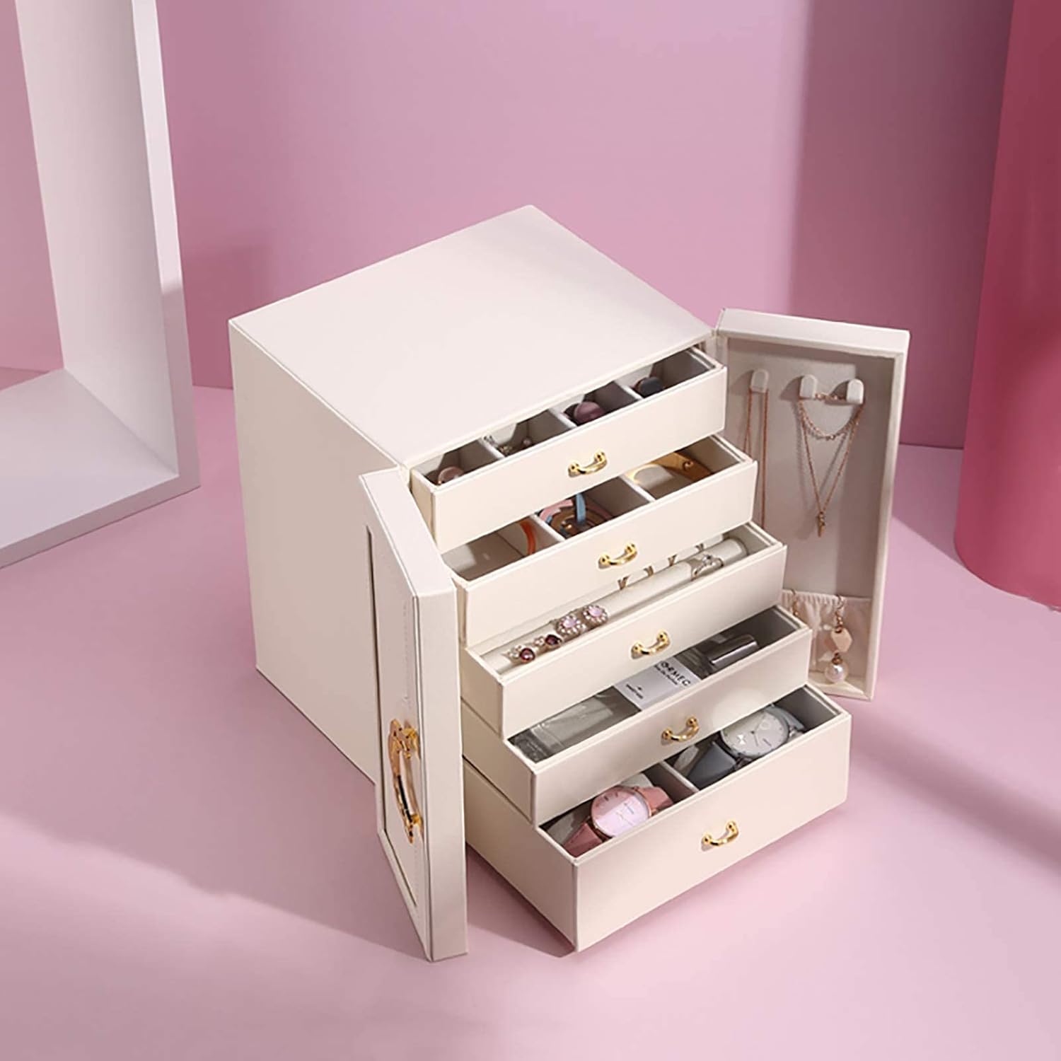 The jewelry box features 5-tier drawers with various compartments, including a total of 12 compartments for different jewelry types, as well as hooks for necklaces.
