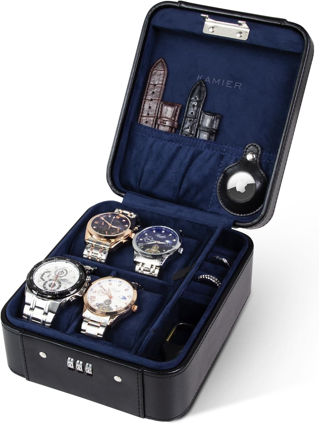 TRAVEL ACCESSORY: Lightweight and perfect for weekend getaways, work travel or just storing your valuable watches and accessories. Keep rings, bracelets, extra watch straps, or any other accessories in a sectioned-off-top compartment, and keep 4 watches safe below. DIMENSIONS: 6.1*7.2*3.3 inch