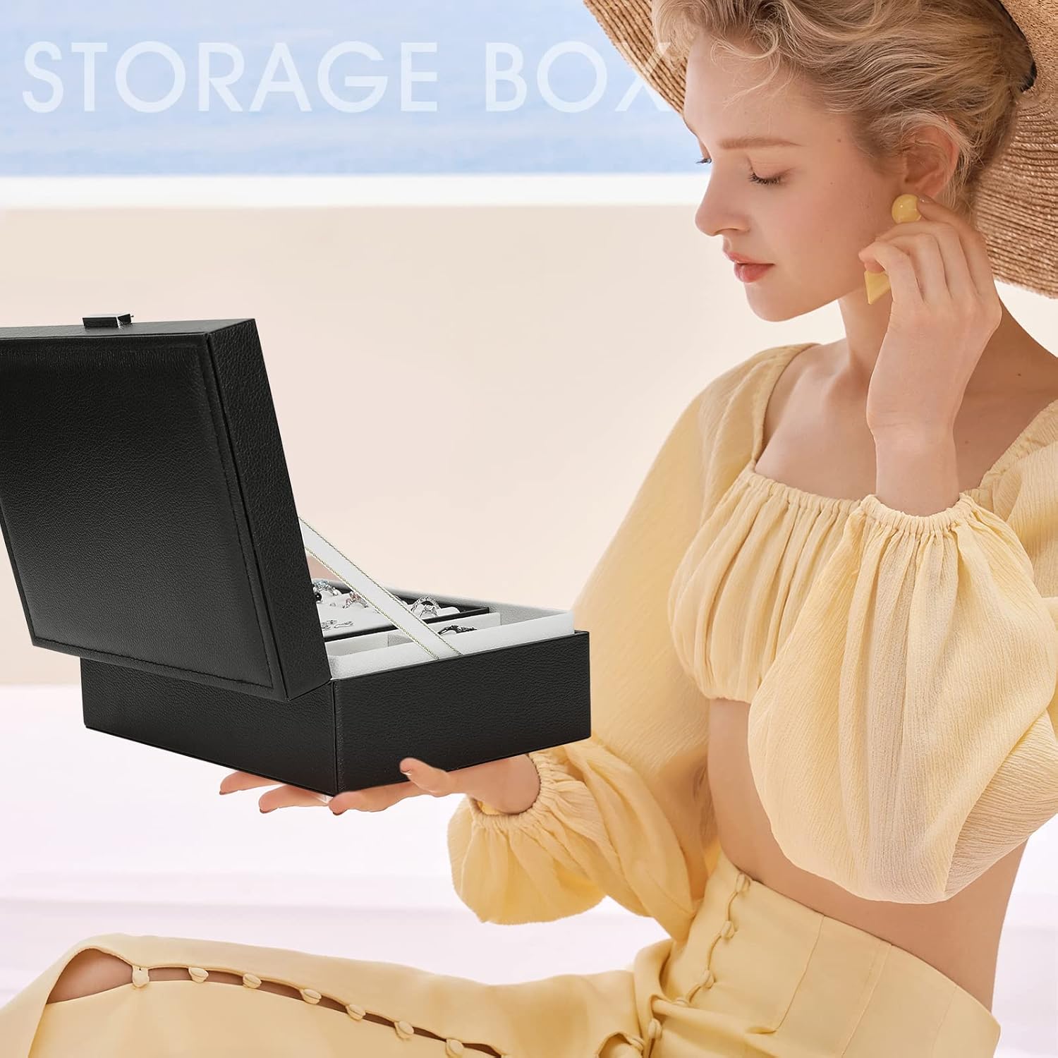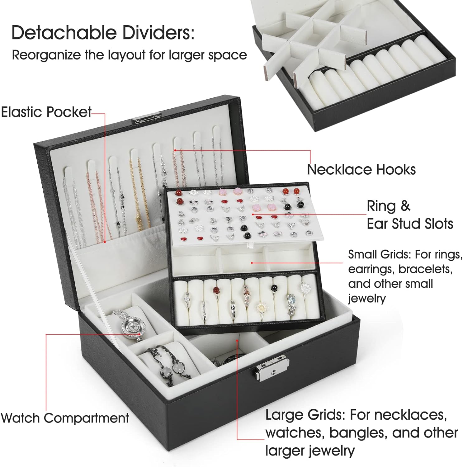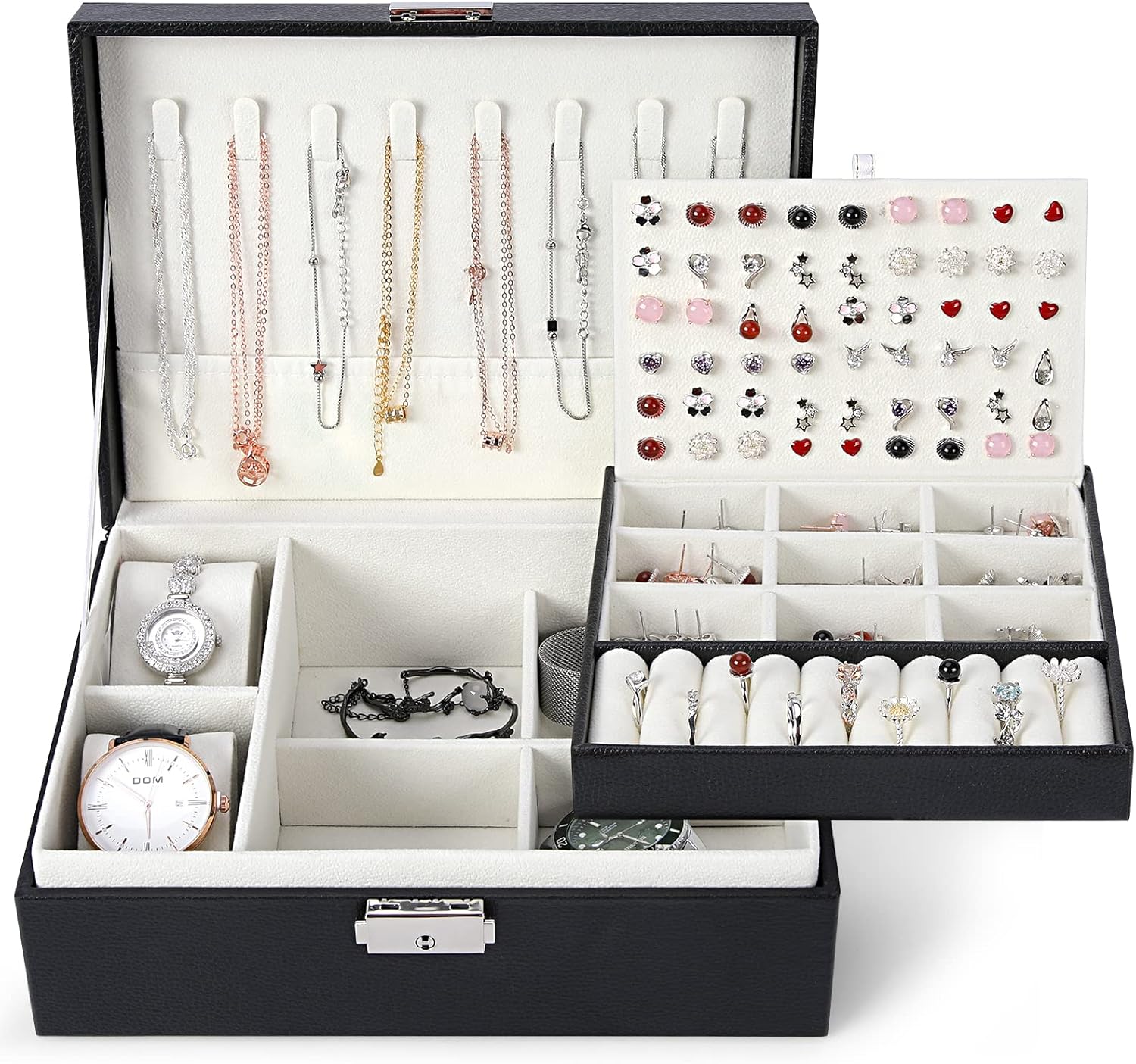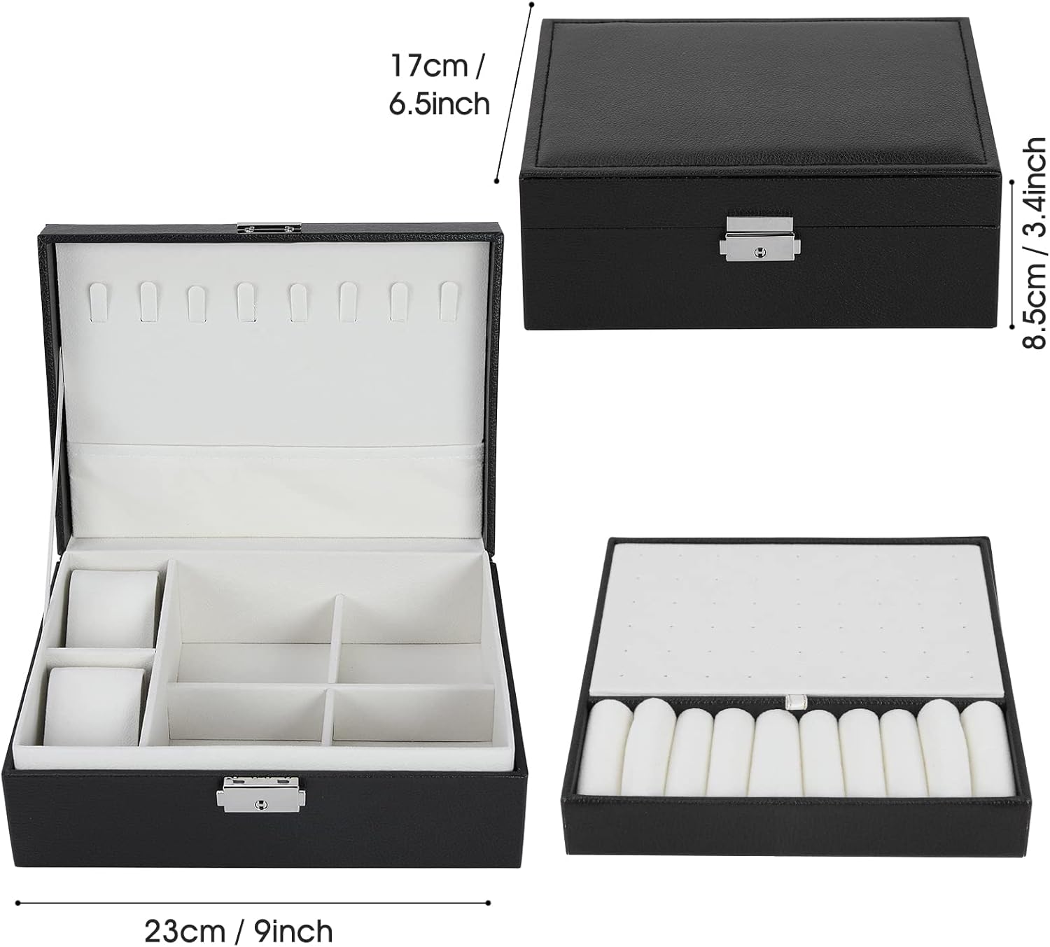 KTMOUW Jewelry Box, 2 Layer Large Jewelry Organizer PU Leather Travel Jewelry Case With Lock Vintage Jewelry Storage Display Case with Removable Tray for Rings Earrings Necklace Bracelet Watch, Black