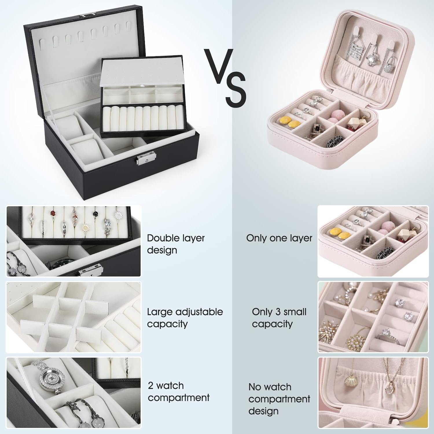 【Practical 2 Layer Design】Jewelry organizer offers different areas for saving your various jewelry. Top lid with 8 hooks and elastic pouch keeps necklaces stay in place. There are 2 watch compartments and 4 small slots on the bottom. Removable layer can hold 24 pairs earrings, 18 rings and a large adjustable space for storage cufflinks, brooches and other little jewelry