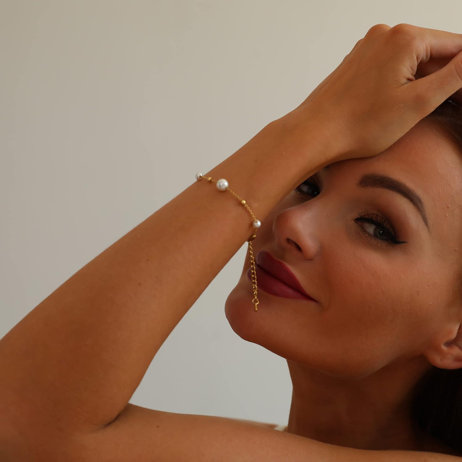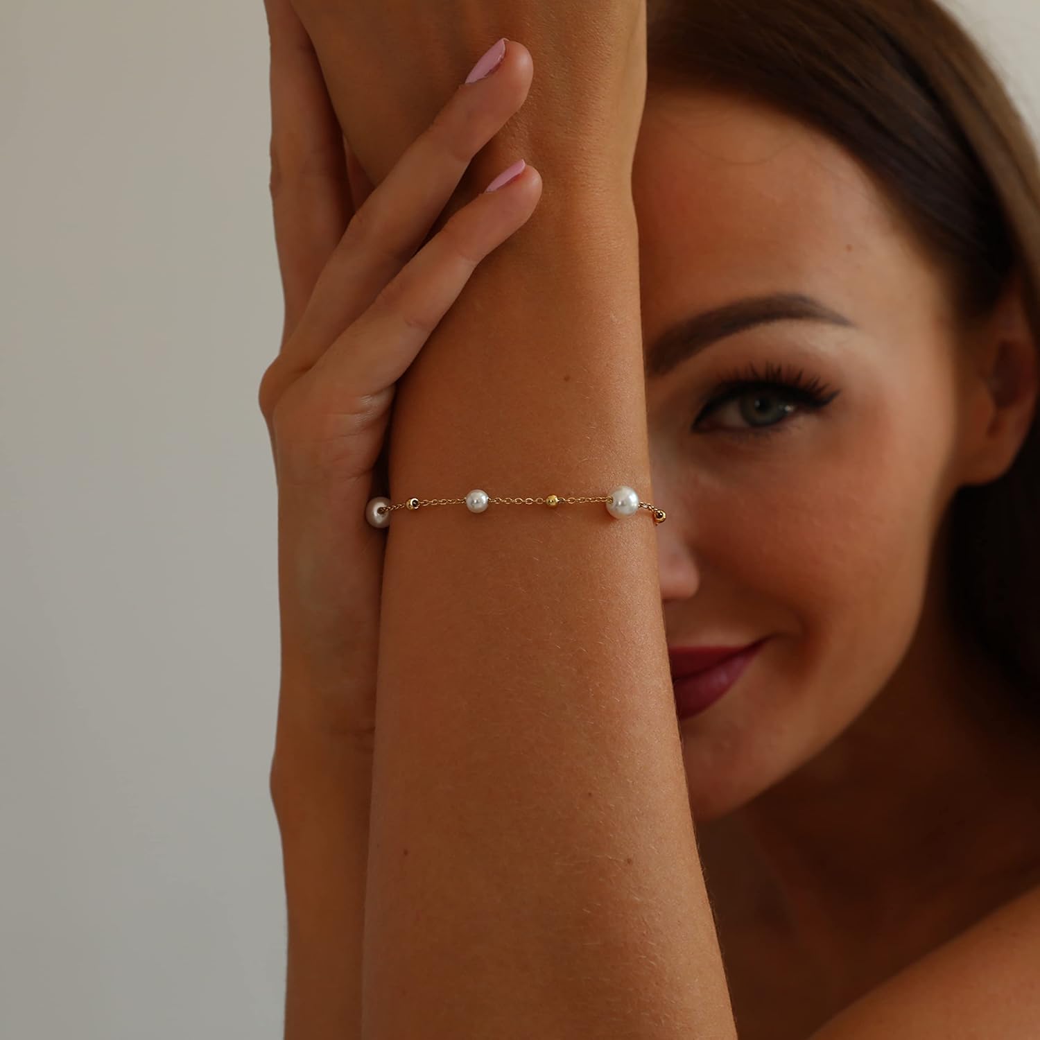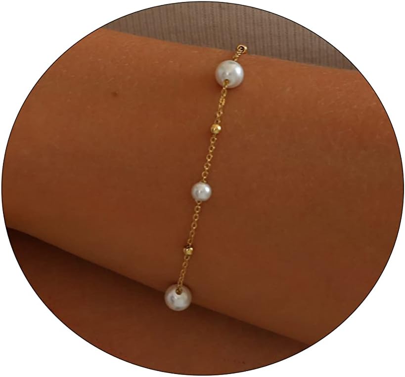 Kyazeo Dainty Gold Bracelets for Women 18K Gold Plated Simple Pearl Cross Cuban Herringbone Link Chain Bracelet Bridesmaid Jewelry