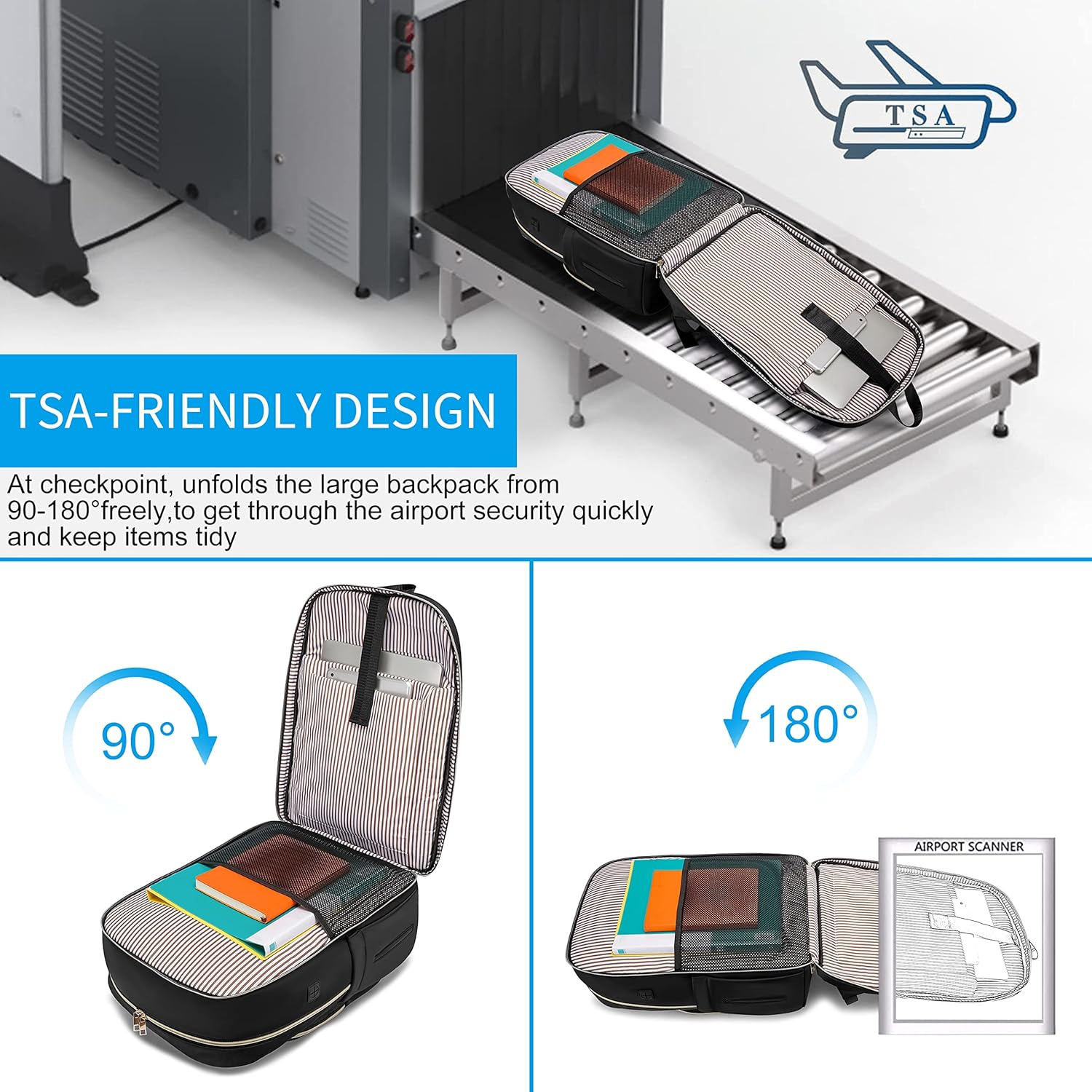 TSA-Design:TSA-Friendly backpack can be easily scanned by security machine.At Checkpoint,unfolds the backpack freely 90-180 degree and the laptop stays flat without taking it from the backpack, making it getting through security checkpoint more efficient.