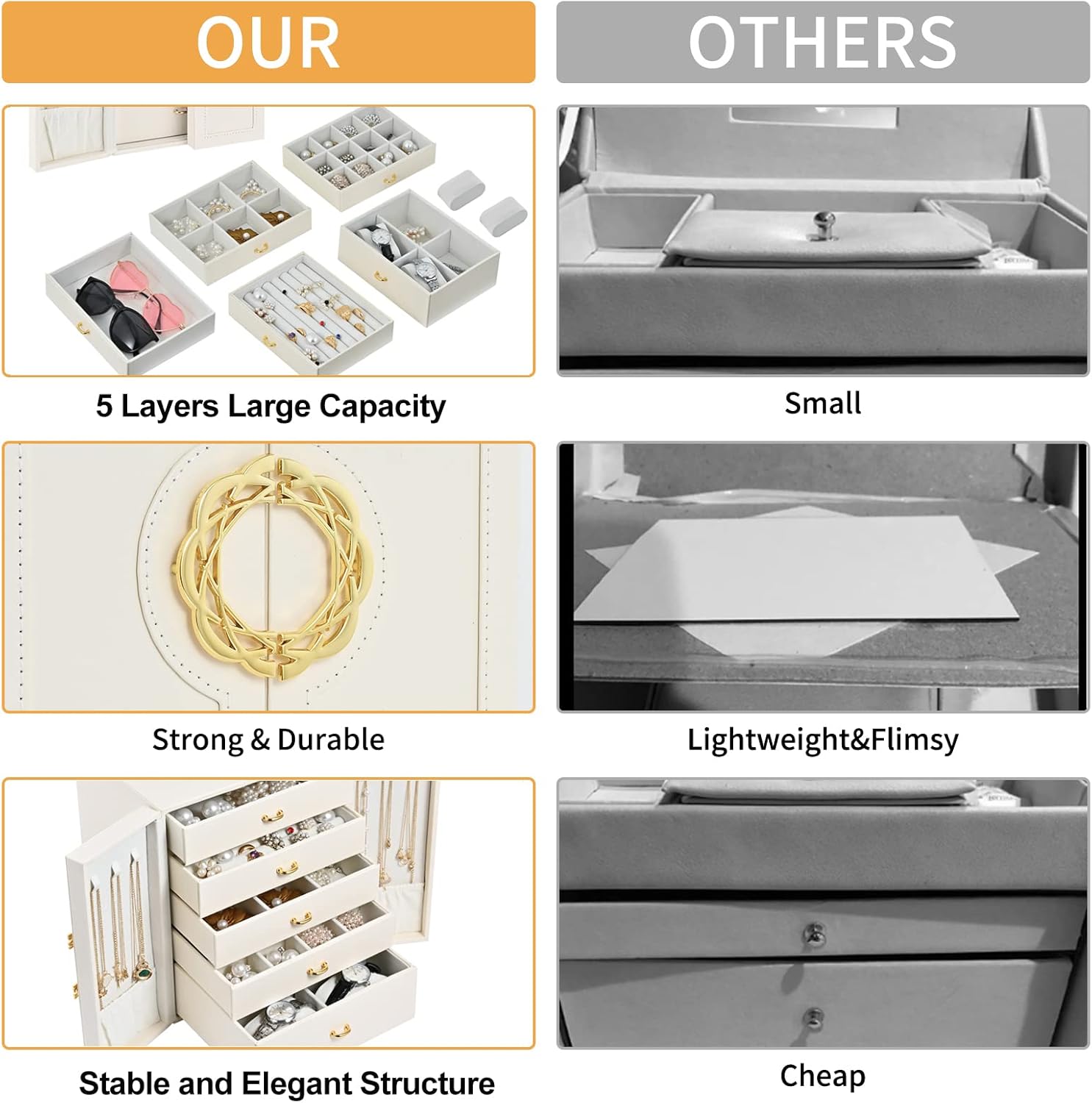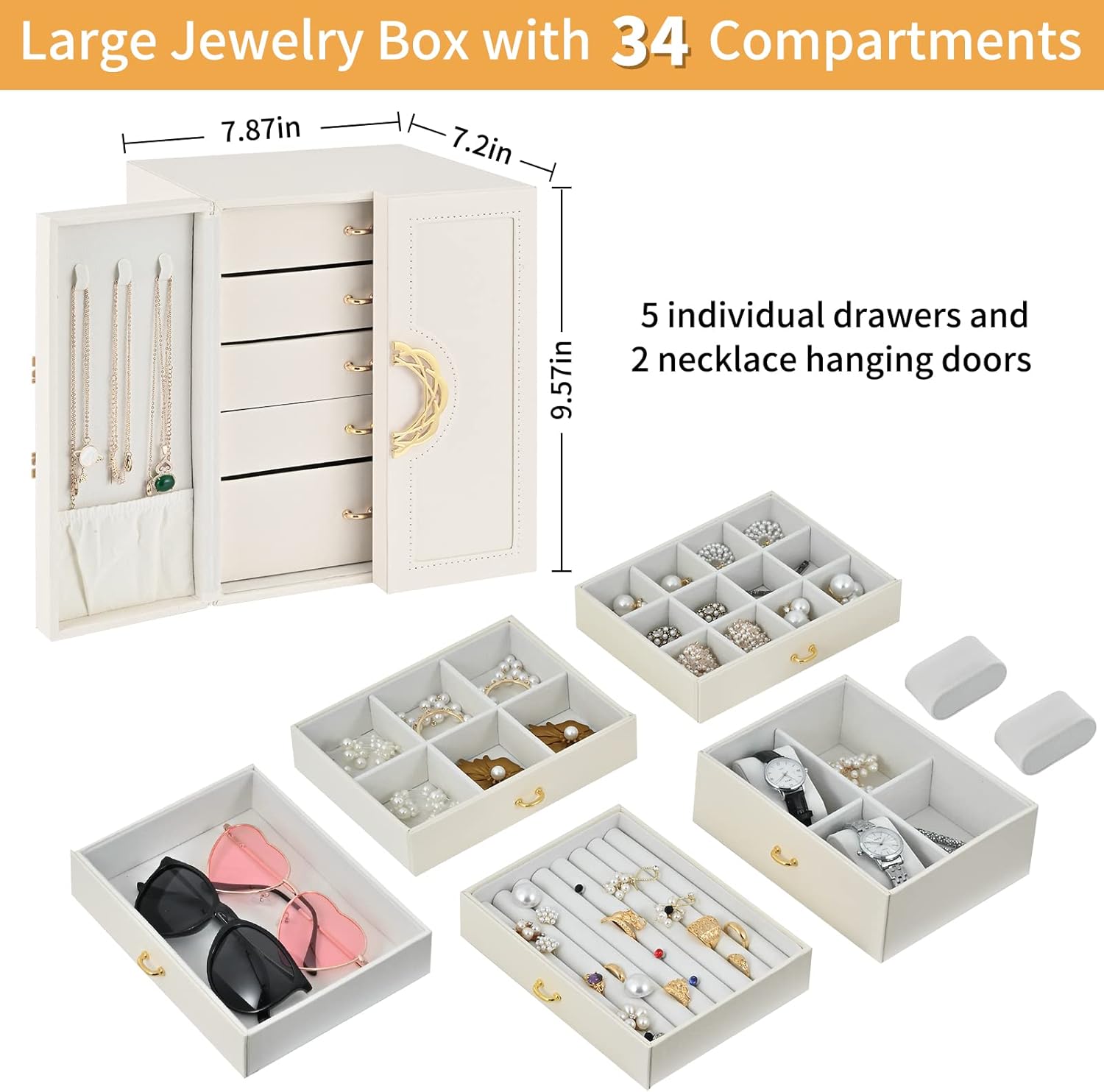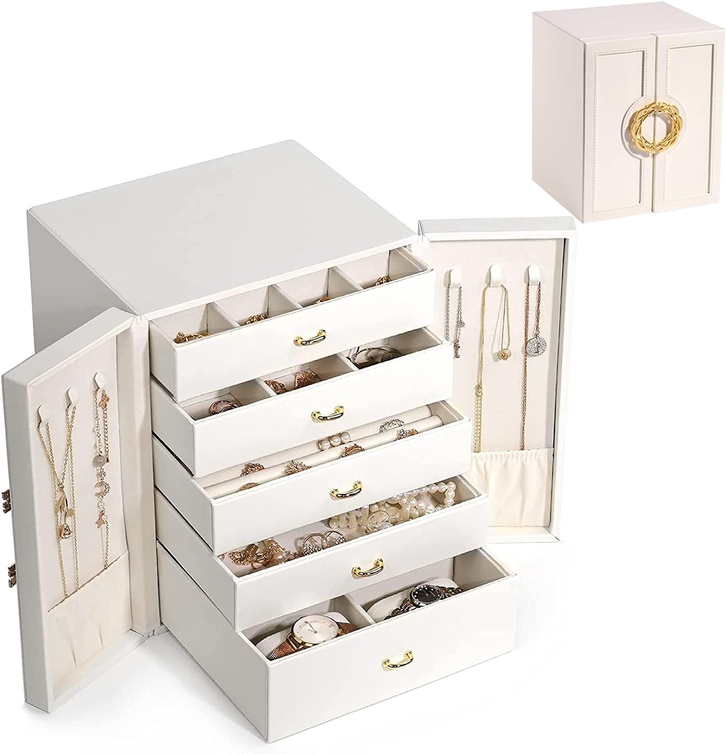Large Jewelry Box Jewelry Organizer,5-Layer Jewelry Display Storage Case for Earring Necklace Bracelets Rings Watches Jewelry Holder (Off White)